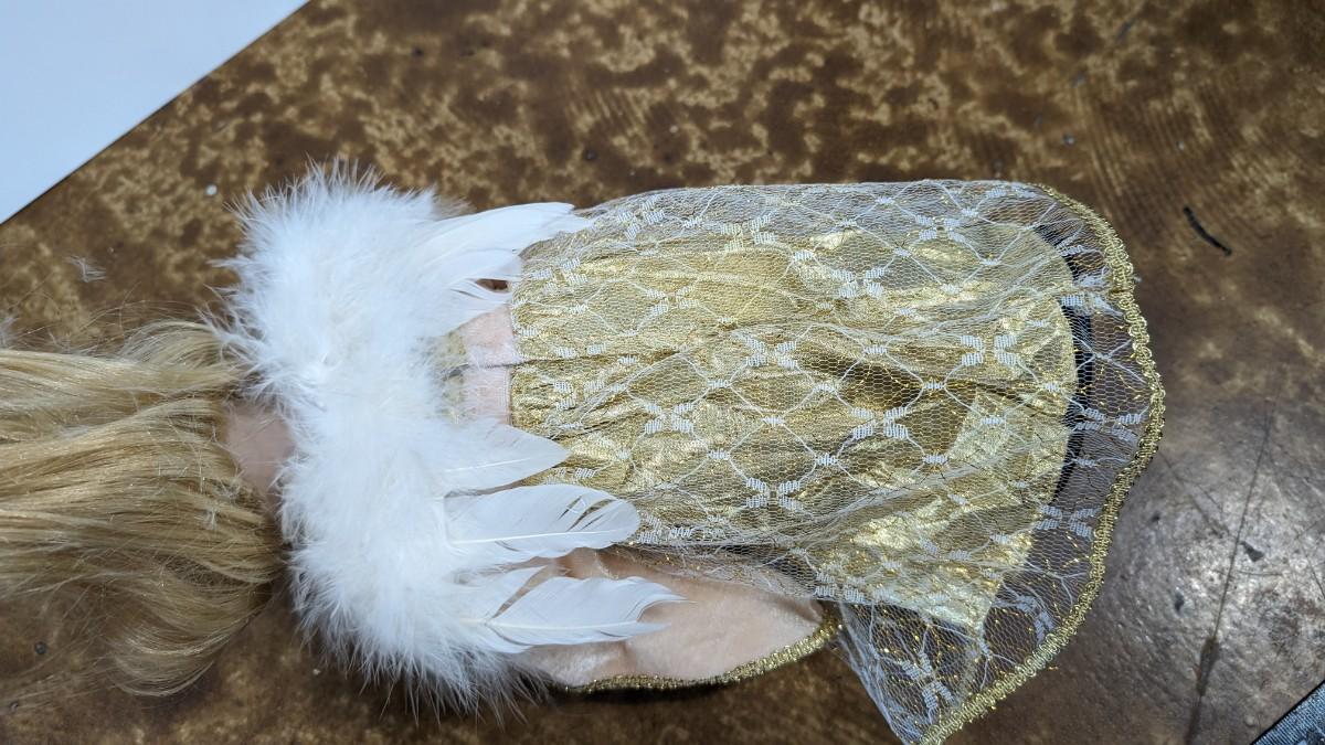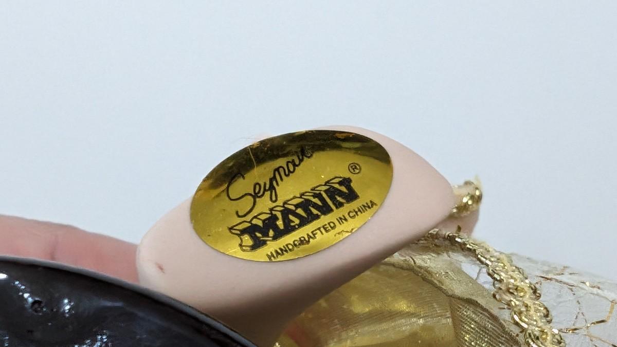 This is a nice vintage Seymour Mann ceramic angel doll with feather wings in a gold dress. It is about 10" tall.