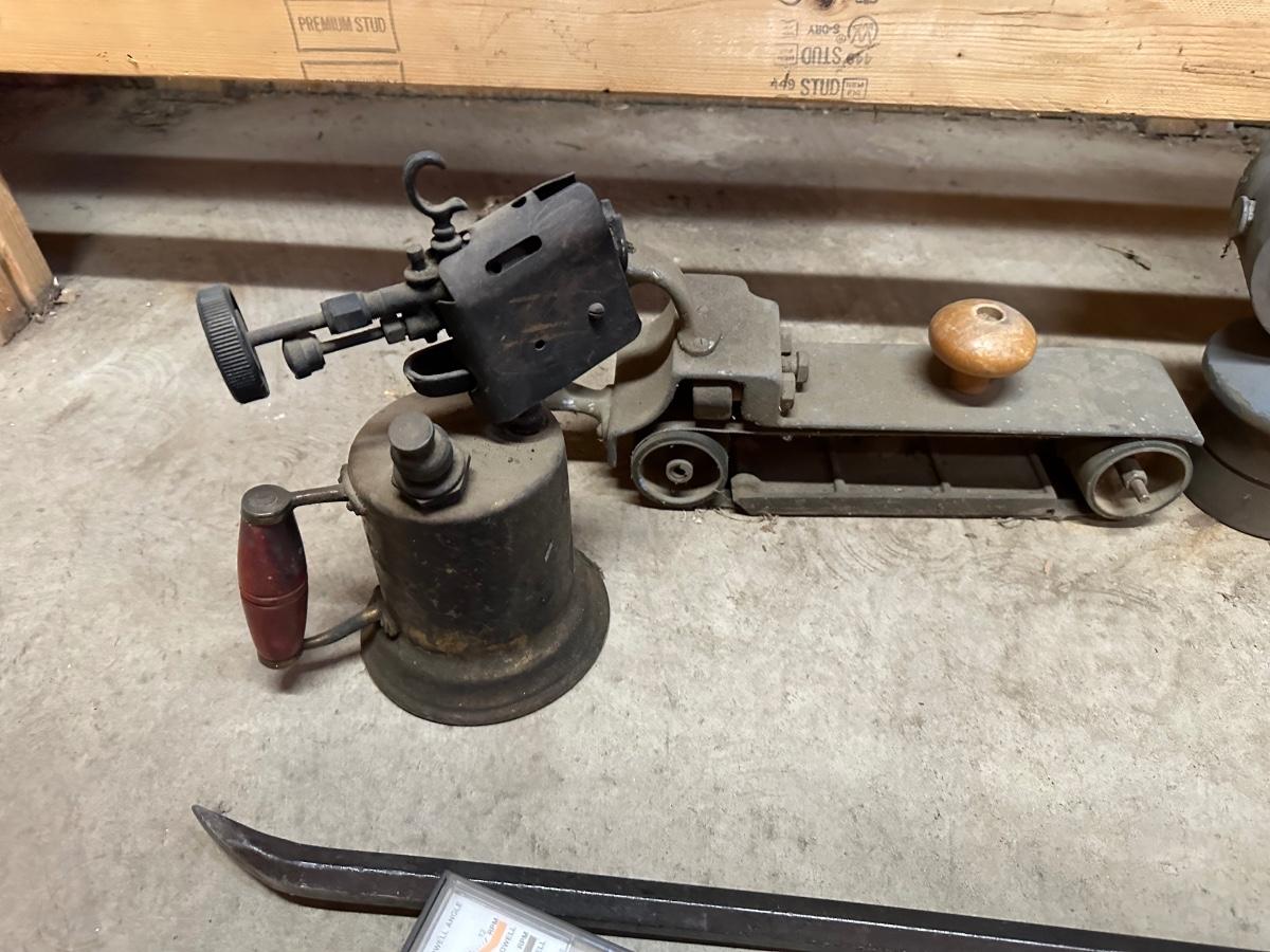 VINTAGE SHAFT DRIVEN BELT SANDER, VINTAGE BLOW TORCH, DWELL METER, ANTIQUE HAND CRANK VALVE LAPPING TOOL AND MORE