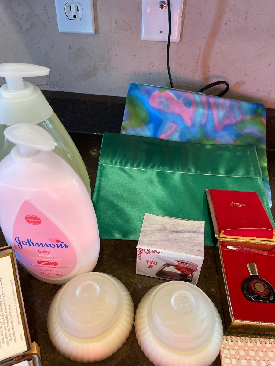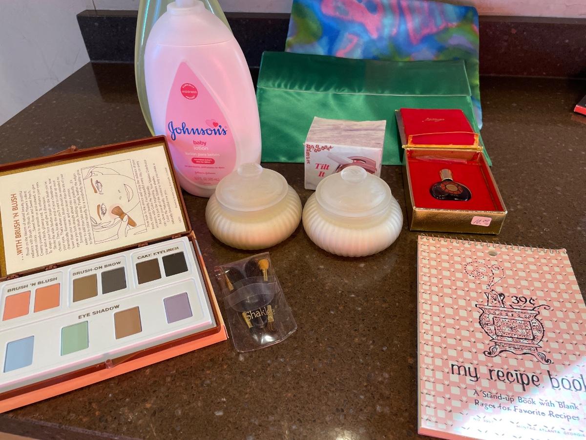 3 complete make up kits, Jzango perfume, 2 soft make up bags, candles, tilt it, baby items and my recipe book