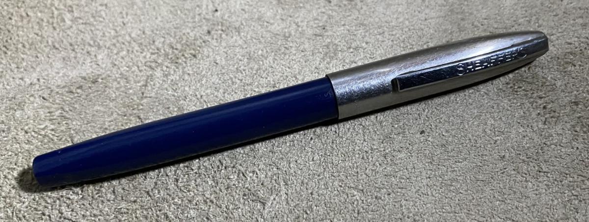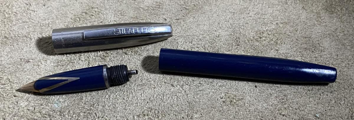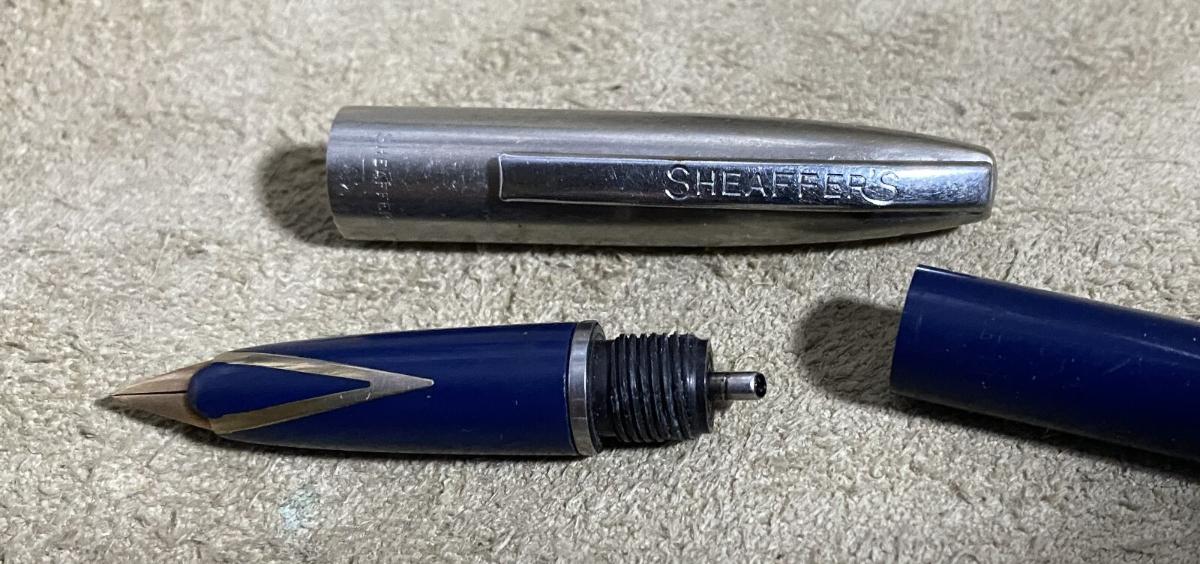 vintage inlaid nib, cartridge pen from Sheaffer's offered for parts or restoration..closed 130mm...Metal top..nib okay...crack in the barrel.
