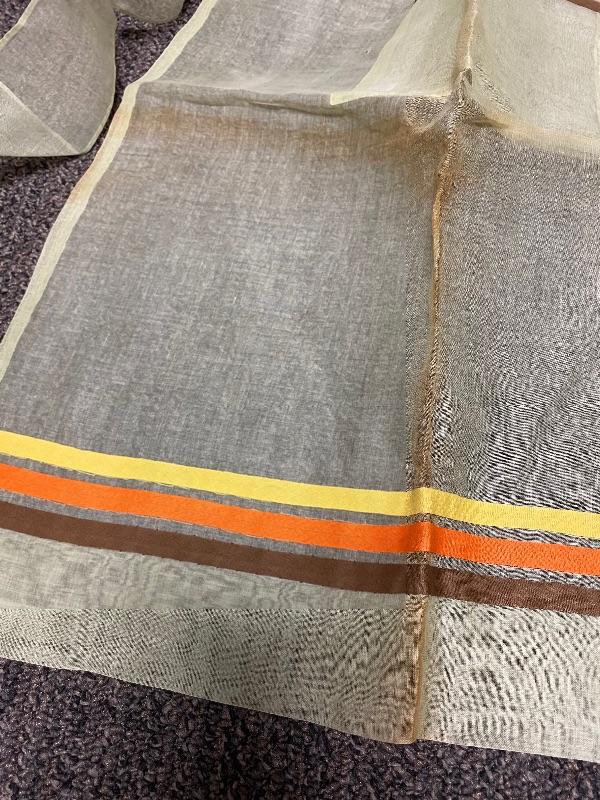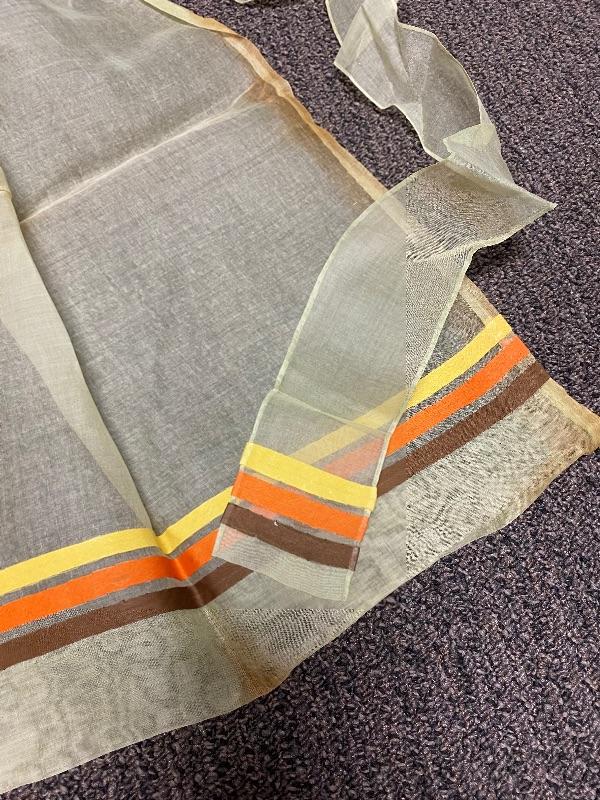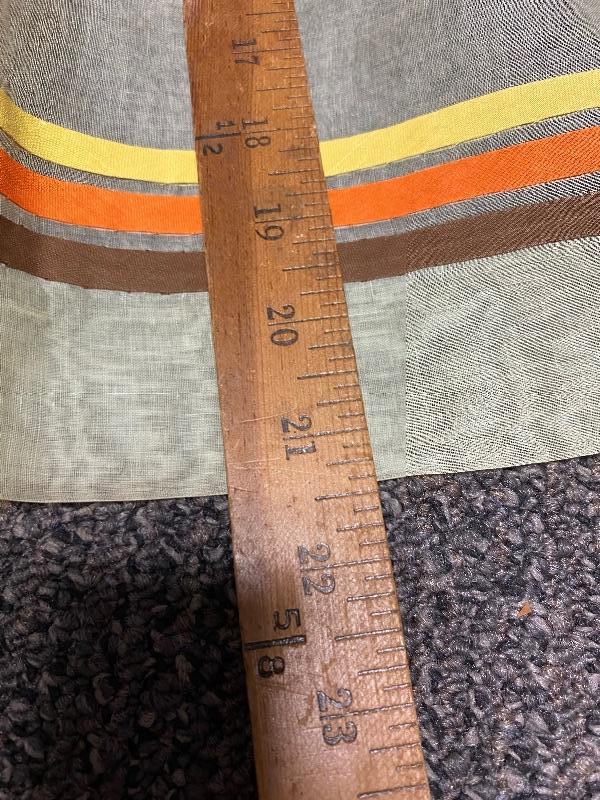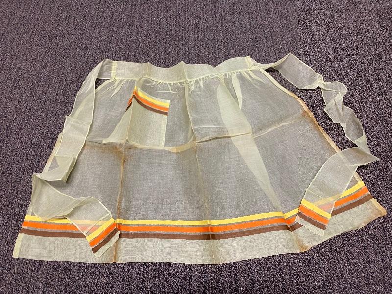 Sheer pale yellow half apron with yellow, brown, and orange stripes. Cute but dark discoloration along edges and creases with a small hole below pocket. 21.5" length.
