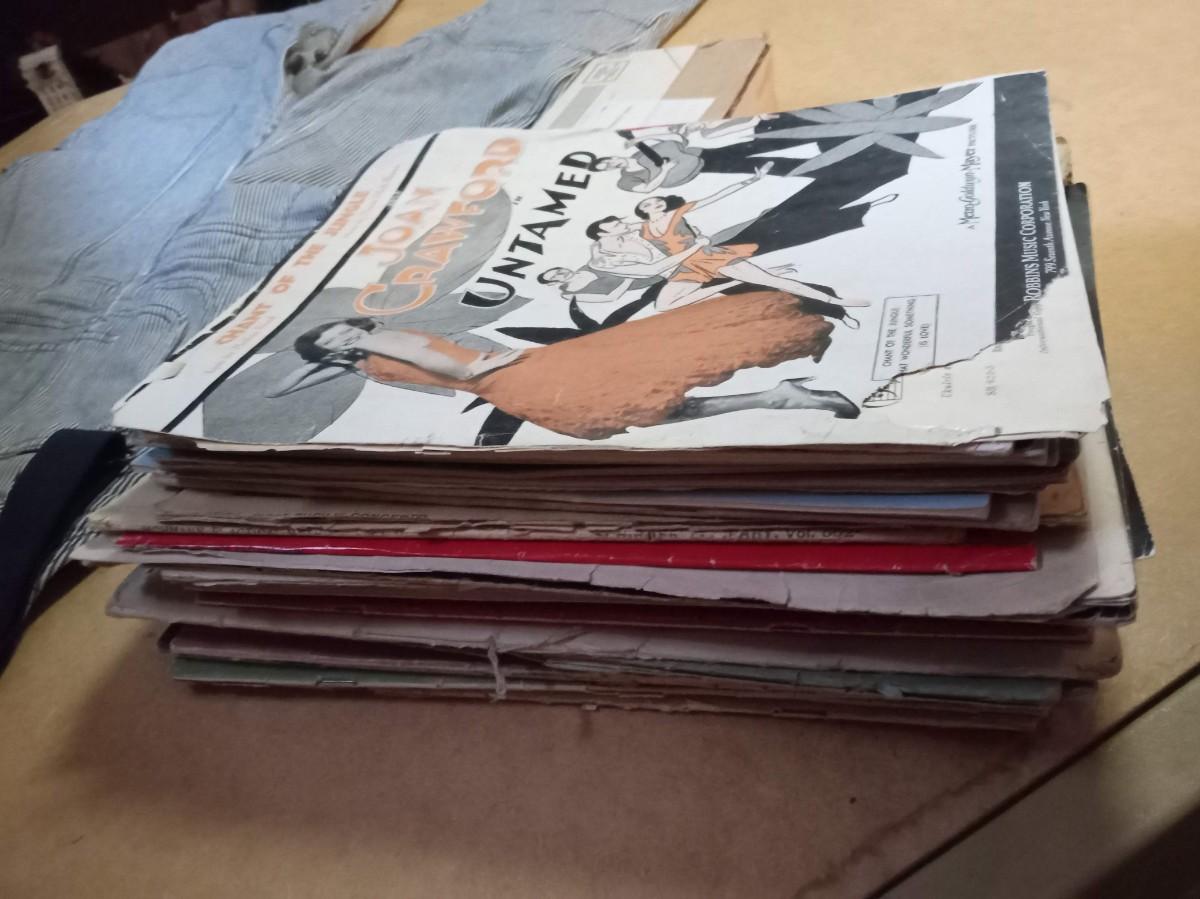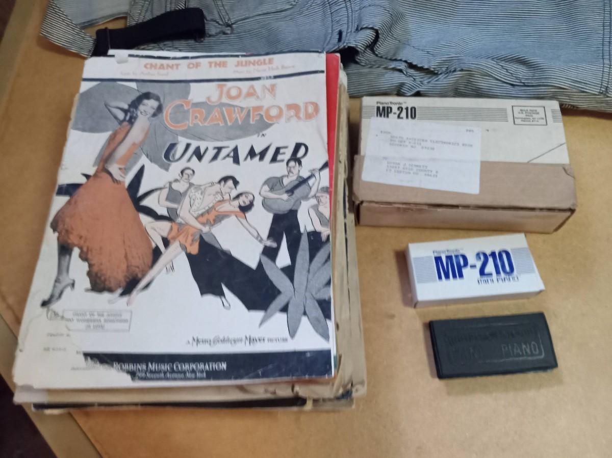 VINTAGE SHEET MUSIC AND A MINI PIANO
