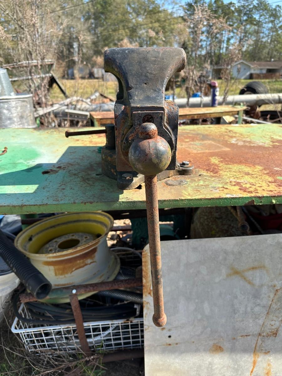 Vintage machinist bench vise marked Sheffield Tool Co. and size 56. Heavy cast-iron construction with swivel base. Jaws appear intact with typical wear and surface rust from age and use. Original paint remnants present. Sold as-is