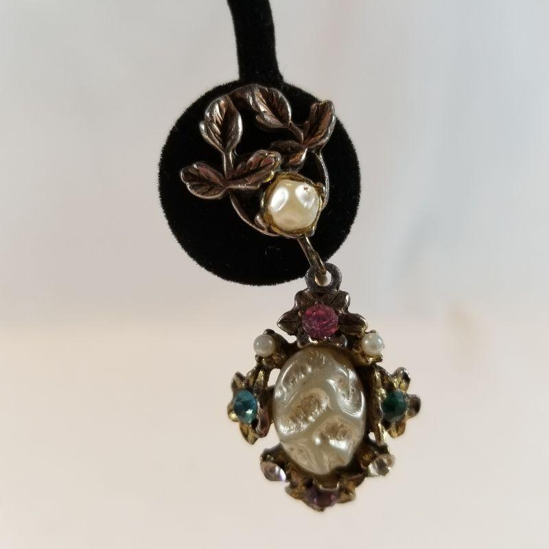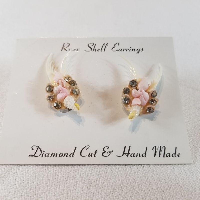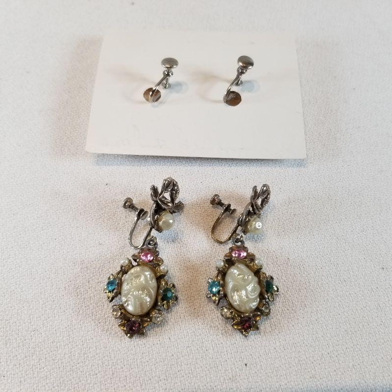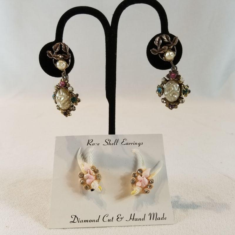 Two pair of very nice vintage earrings - both are screw backs. One is a dangle with metal, stones and pearls - quite vintage. The second pair is hand-made shell and rhinestones - very unique. Both pairs will add that touch of bling for special occasions.