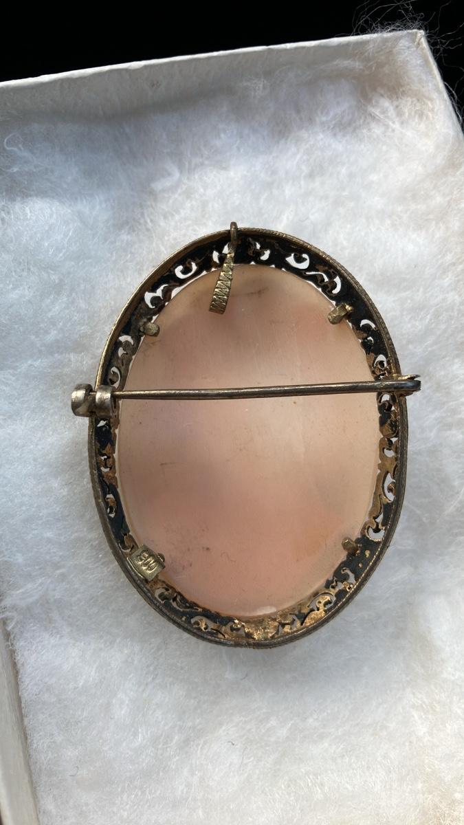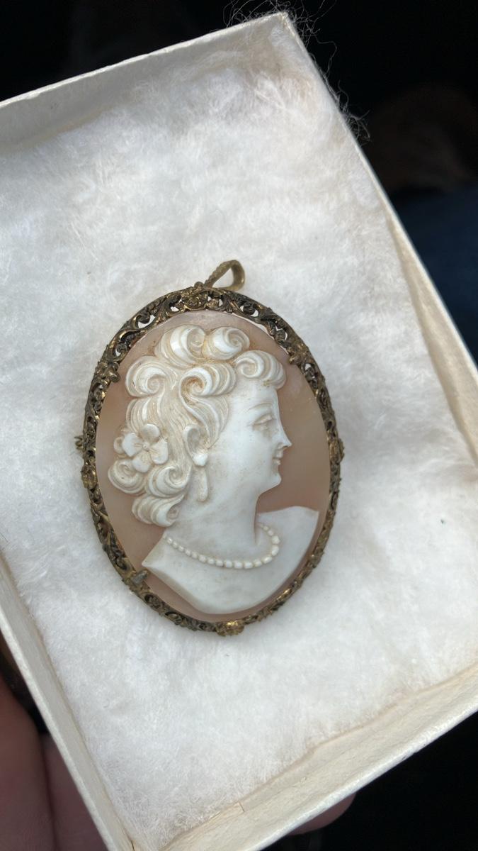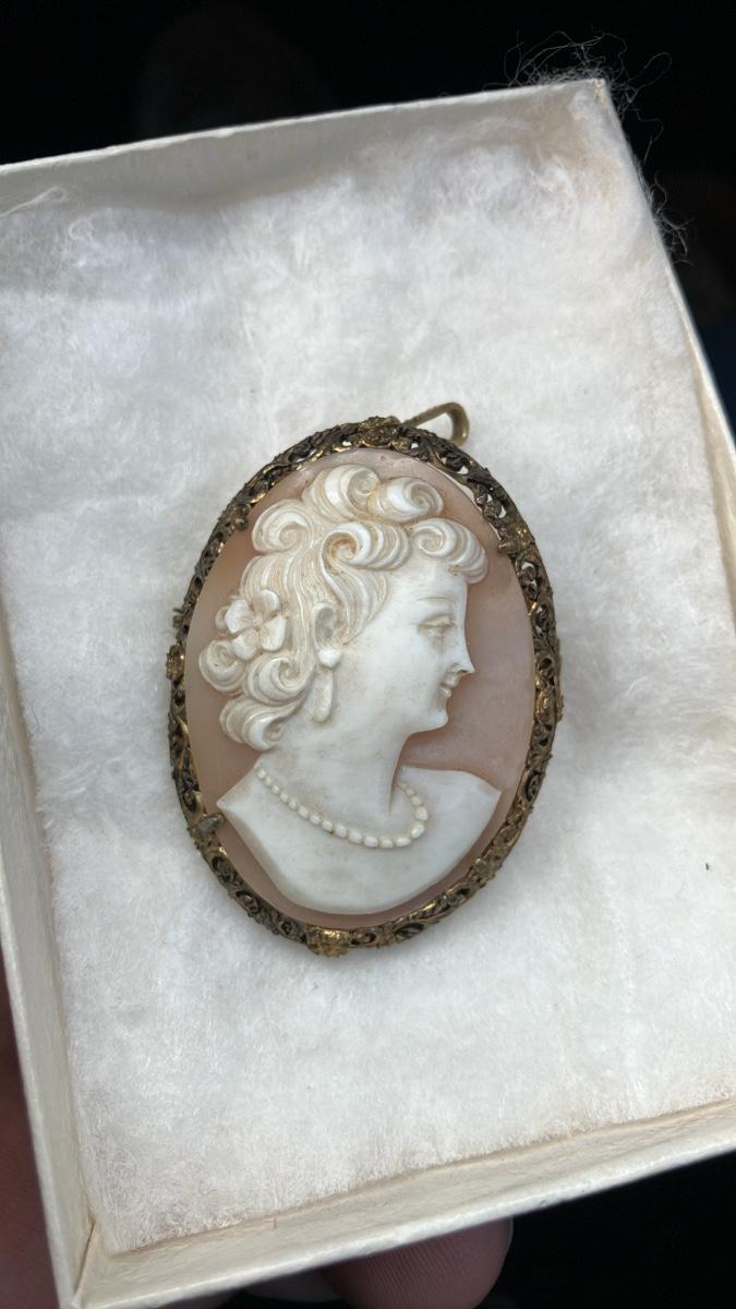 Finely carved antique cameo featuring a graceful Victorian lady with elegant curls, pearl necklace, and earring. Set in a delicate gold-tone filigree frame with convertible bail (wear as brooch or pendant). Perfect heirloom piece in excellent vintage condition.