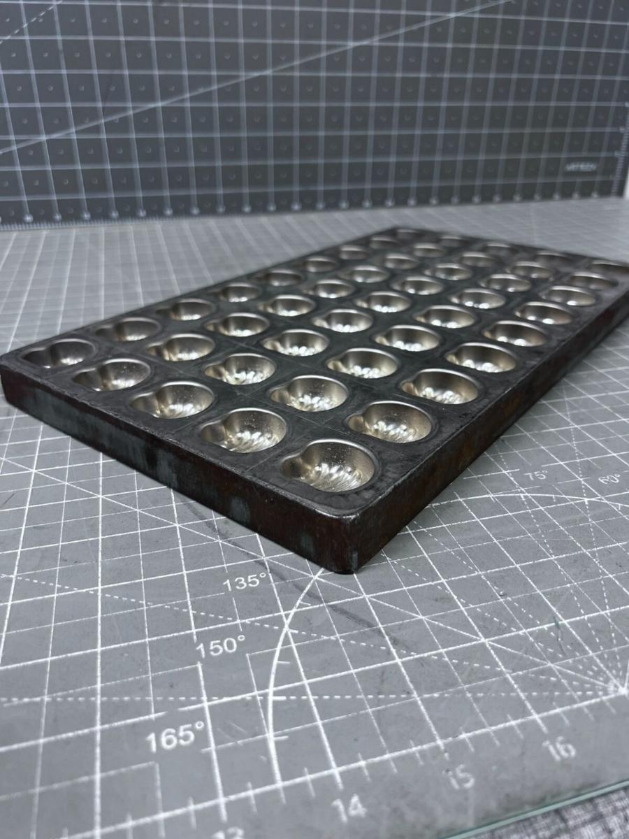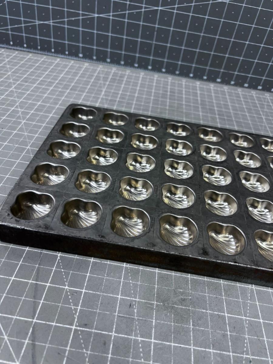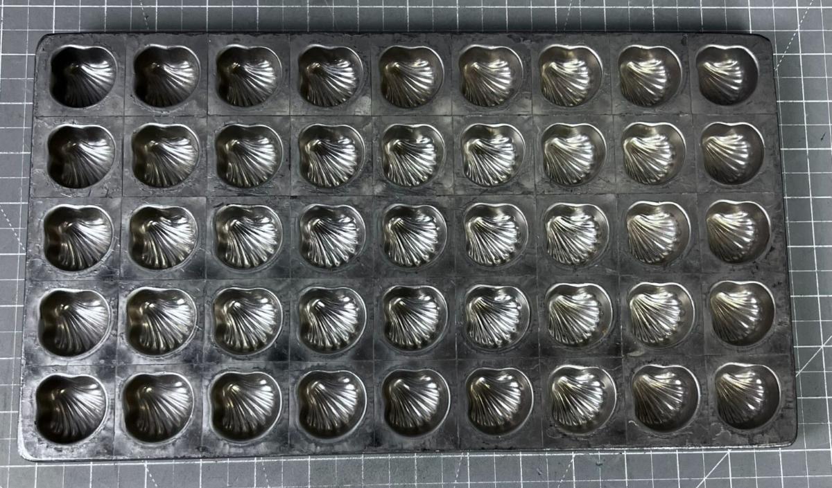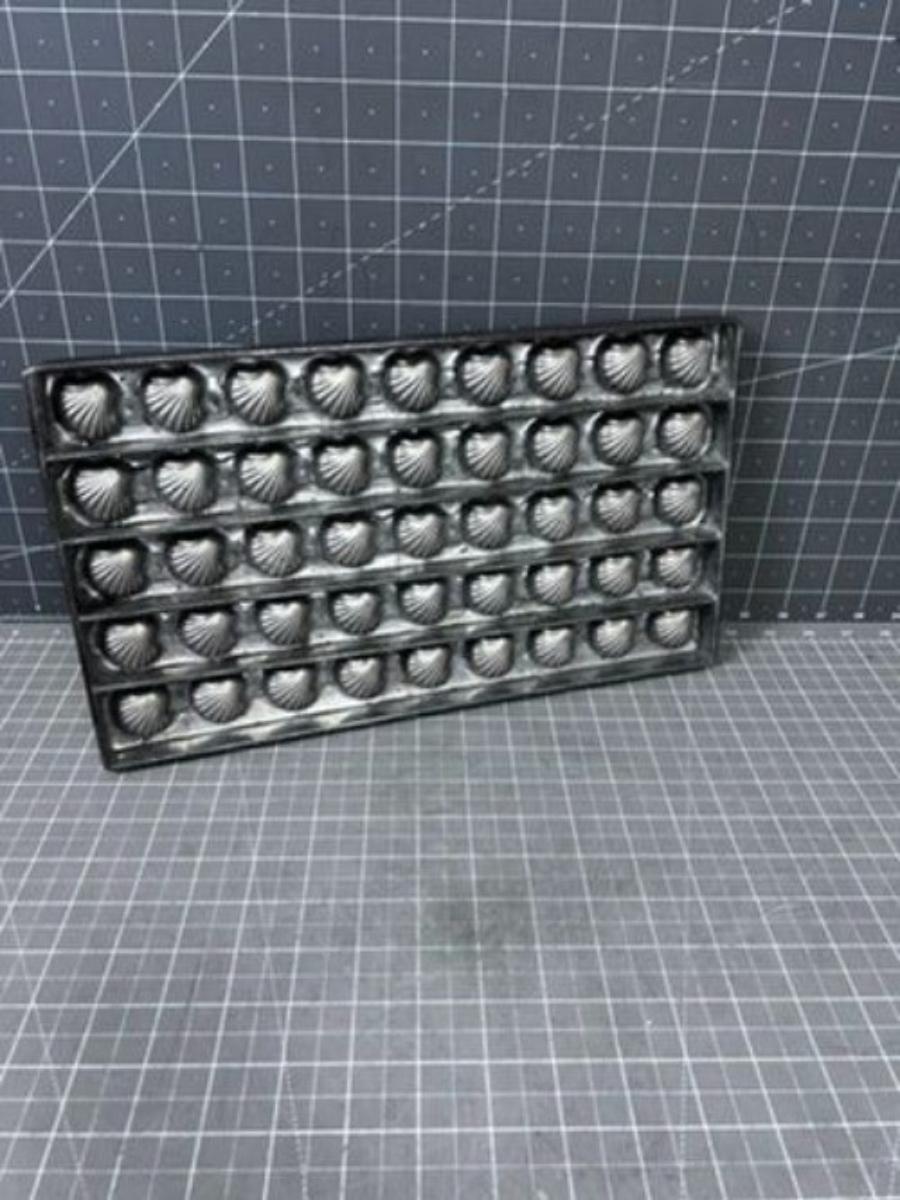 This vintage metal chocolate mold tray features 48 shell-shaped cavities, designed for creating intricate confections or crafts.