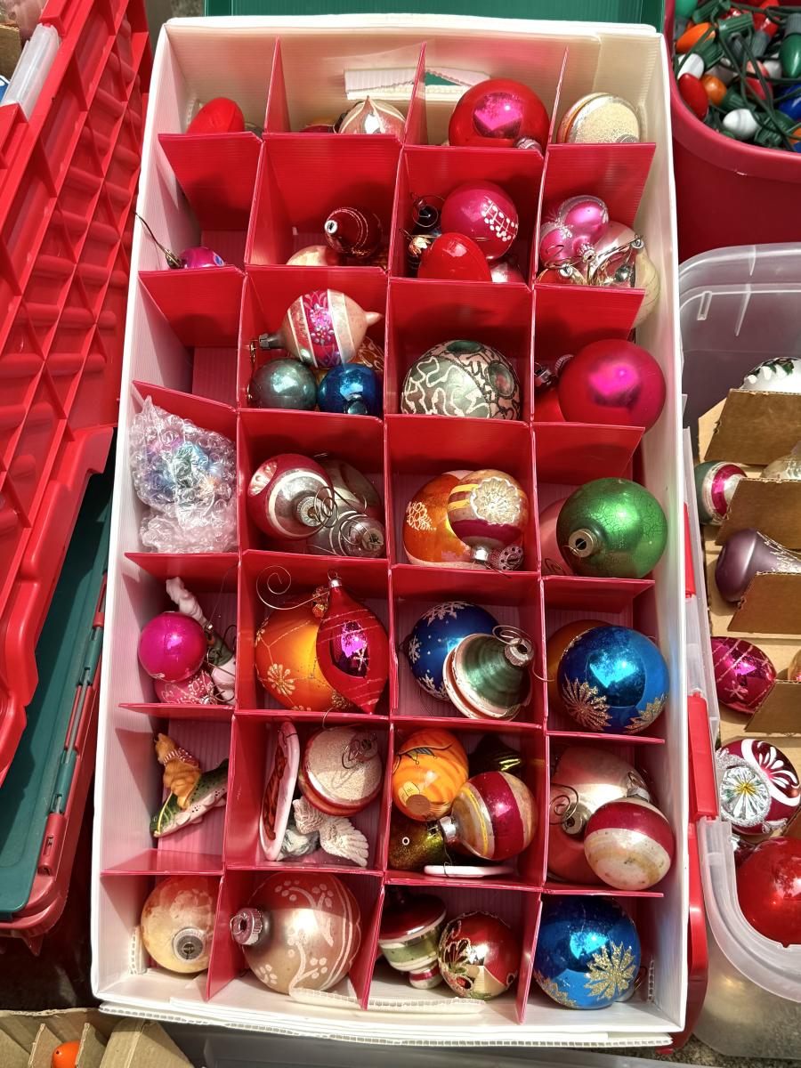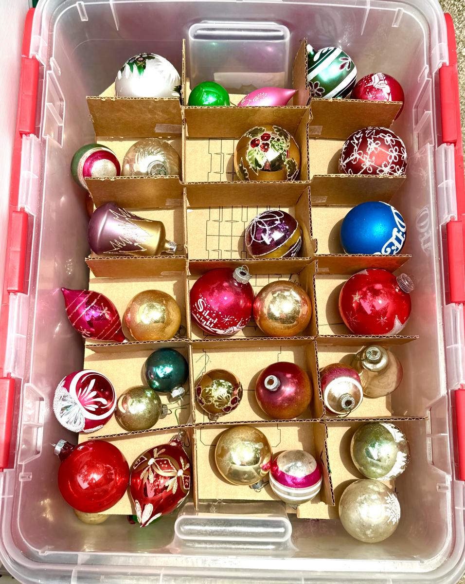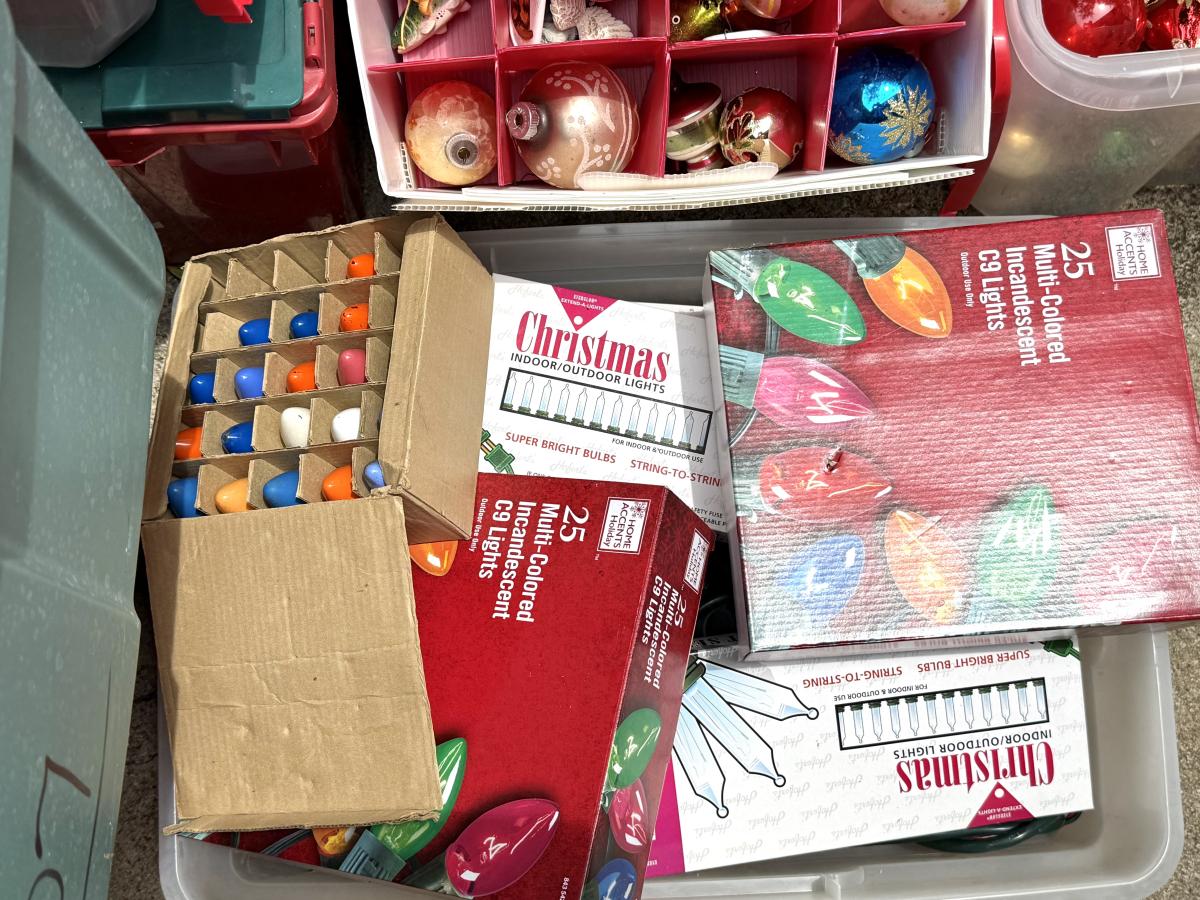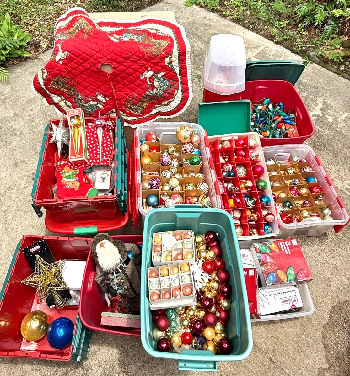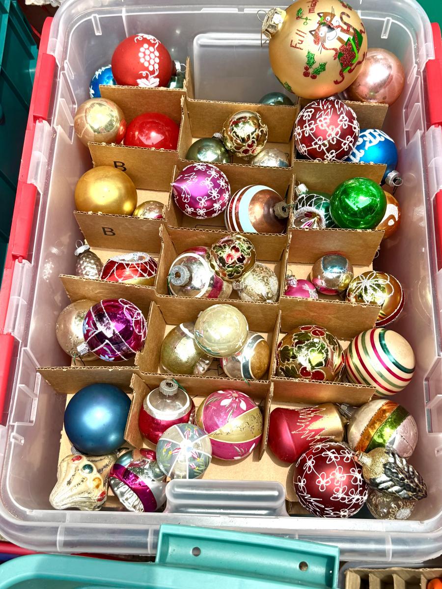 There are assorted vintage ornaments including Shiny Brite brand, vintage lights, vintage decorations, tree toppers, an artificial Christmas tree, plus 10 totes with lids (including a tall wrapping paper tote), and a cardboard ornament box with dividers and lid.