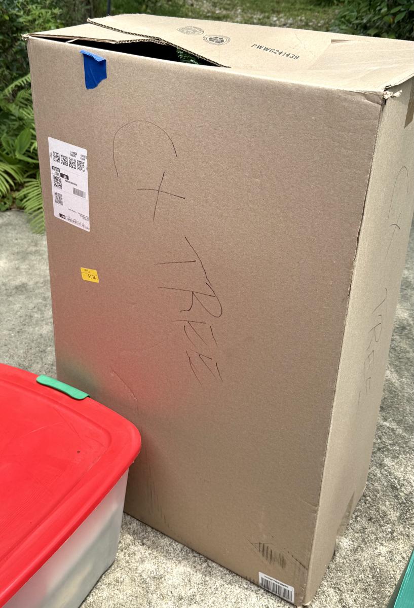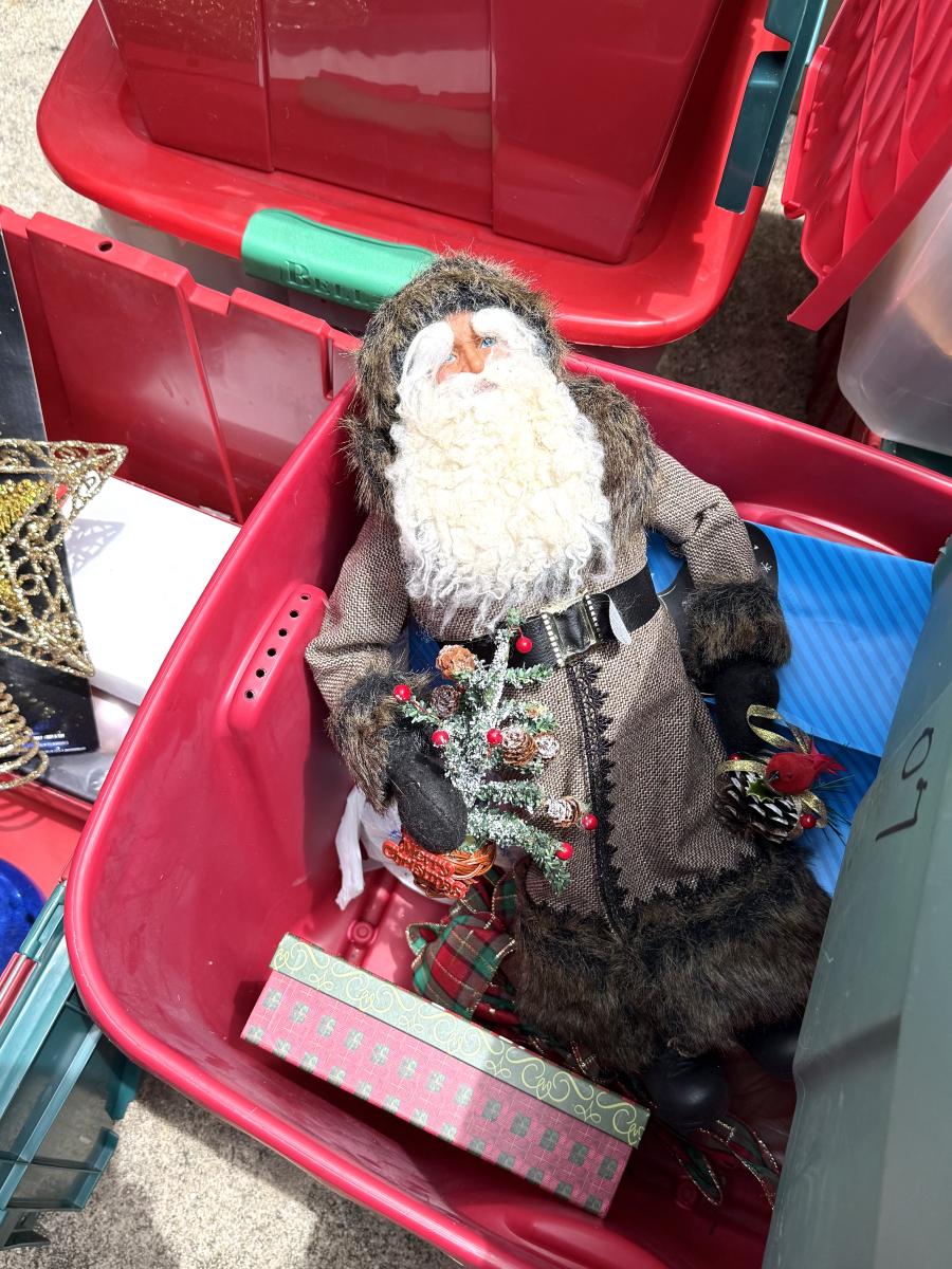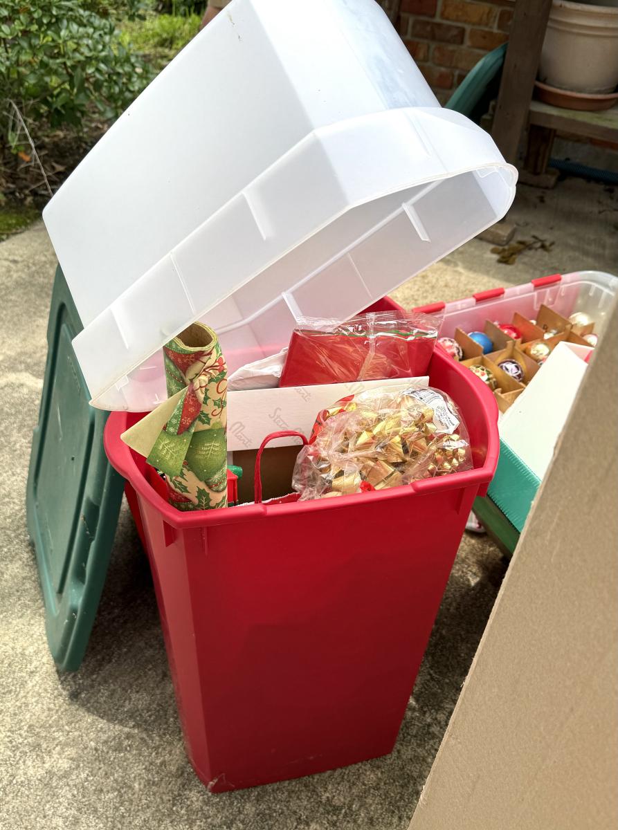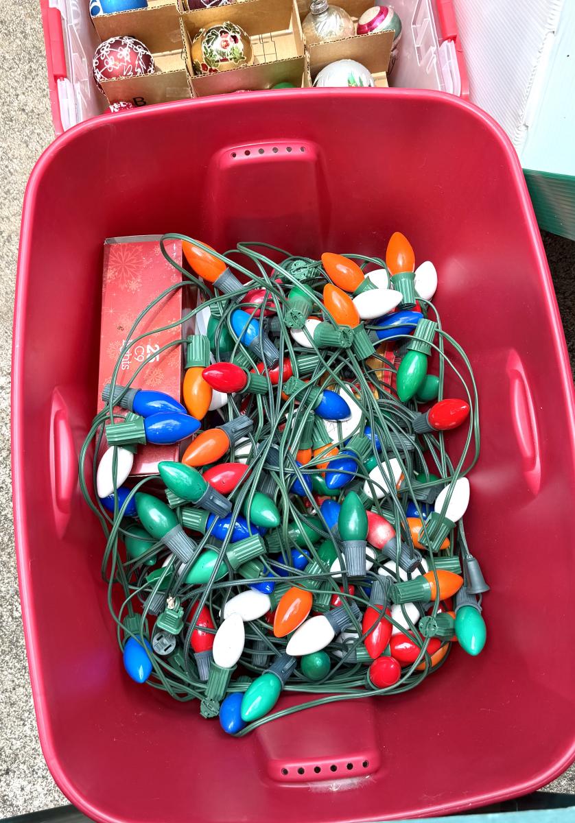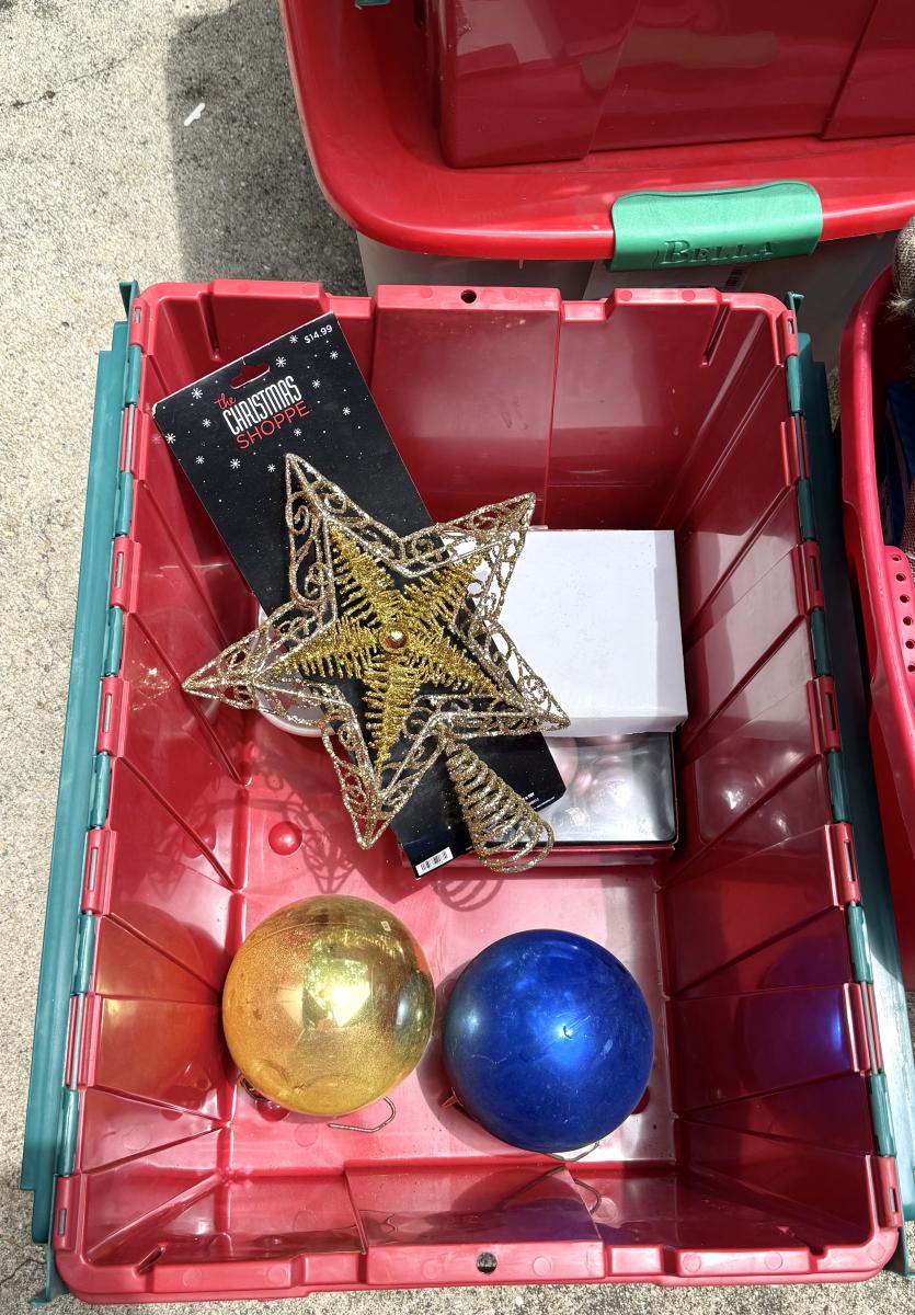There are assorted vintage ornaments including Shiny Brite brand, vintage lights, vintage decorations, tree toppers, an artificial Christmas tree, plus 10 totes with lids (including a tall wrapping paper tote), and a cardboard ornament box with dividers and lid.