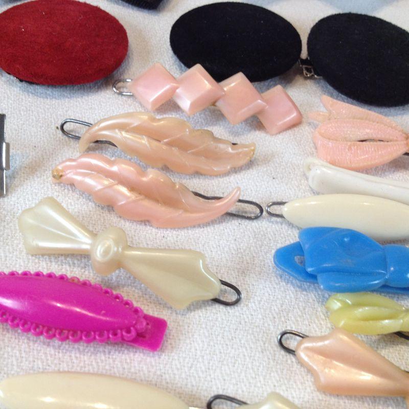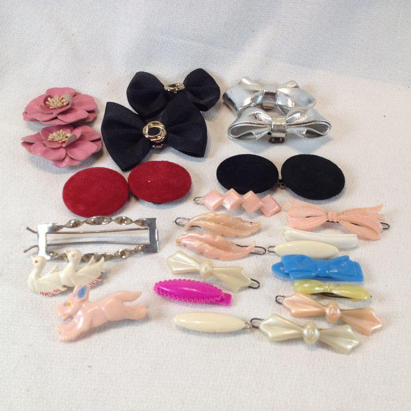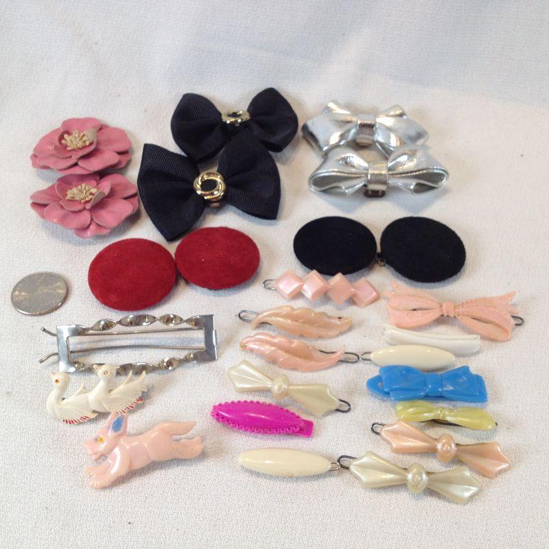 This is a girlie collection of vintage shoe clips and hair barrettes. All are so very fun. There are 5 pairs of shoe clips and 16 barrettes - all are plastic except one which is metal. All are in very good condition. The starting bid is $8.00.