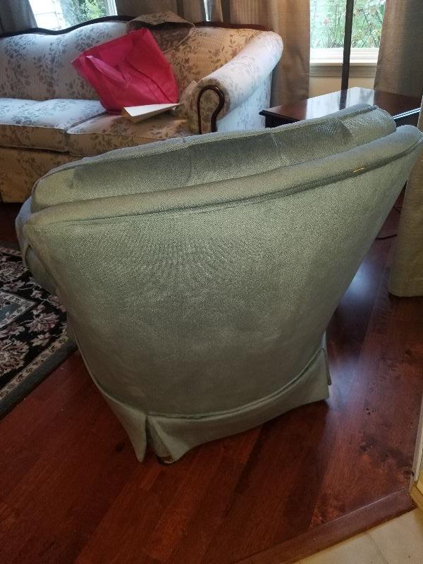 Does NOT swivel. Has wood legs. Its a light blue color and I think a crushed velvet type feel. Shows minor wear and might have some light fading from age. But otherwise nice shape and very usable.