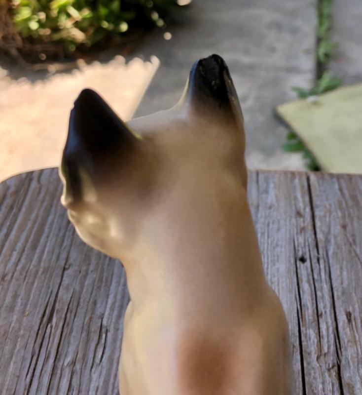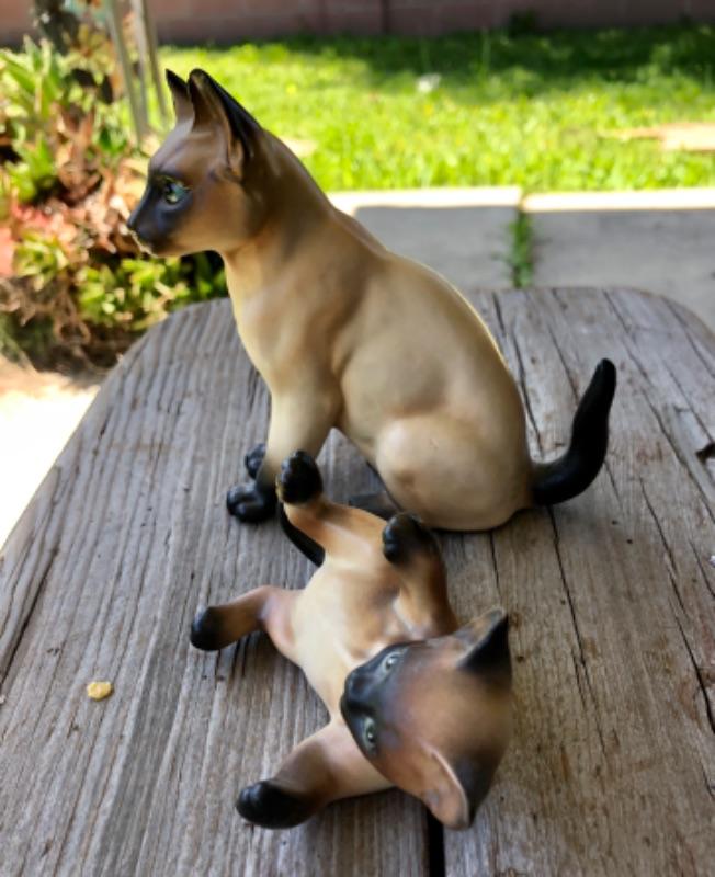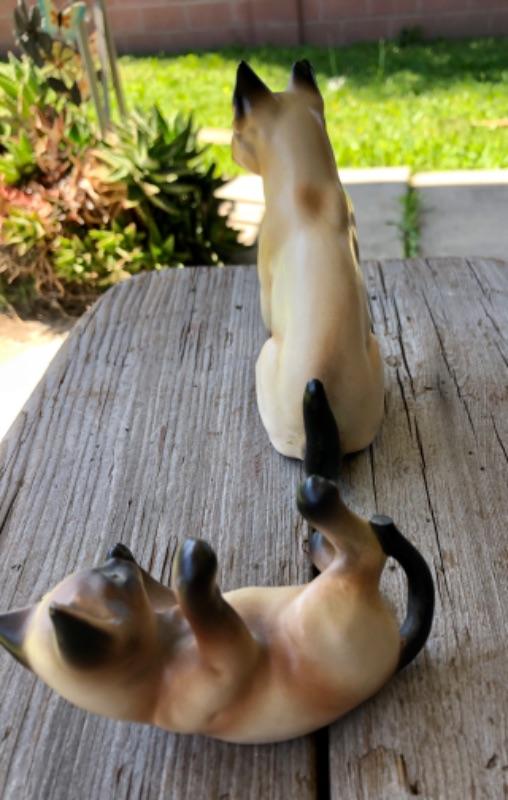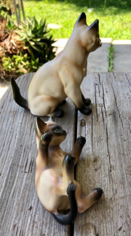 Pair of Siamese cats. There is damage to both. The larger one had its tail reglued and some ear damage. The smaller has the end of its tail missing.