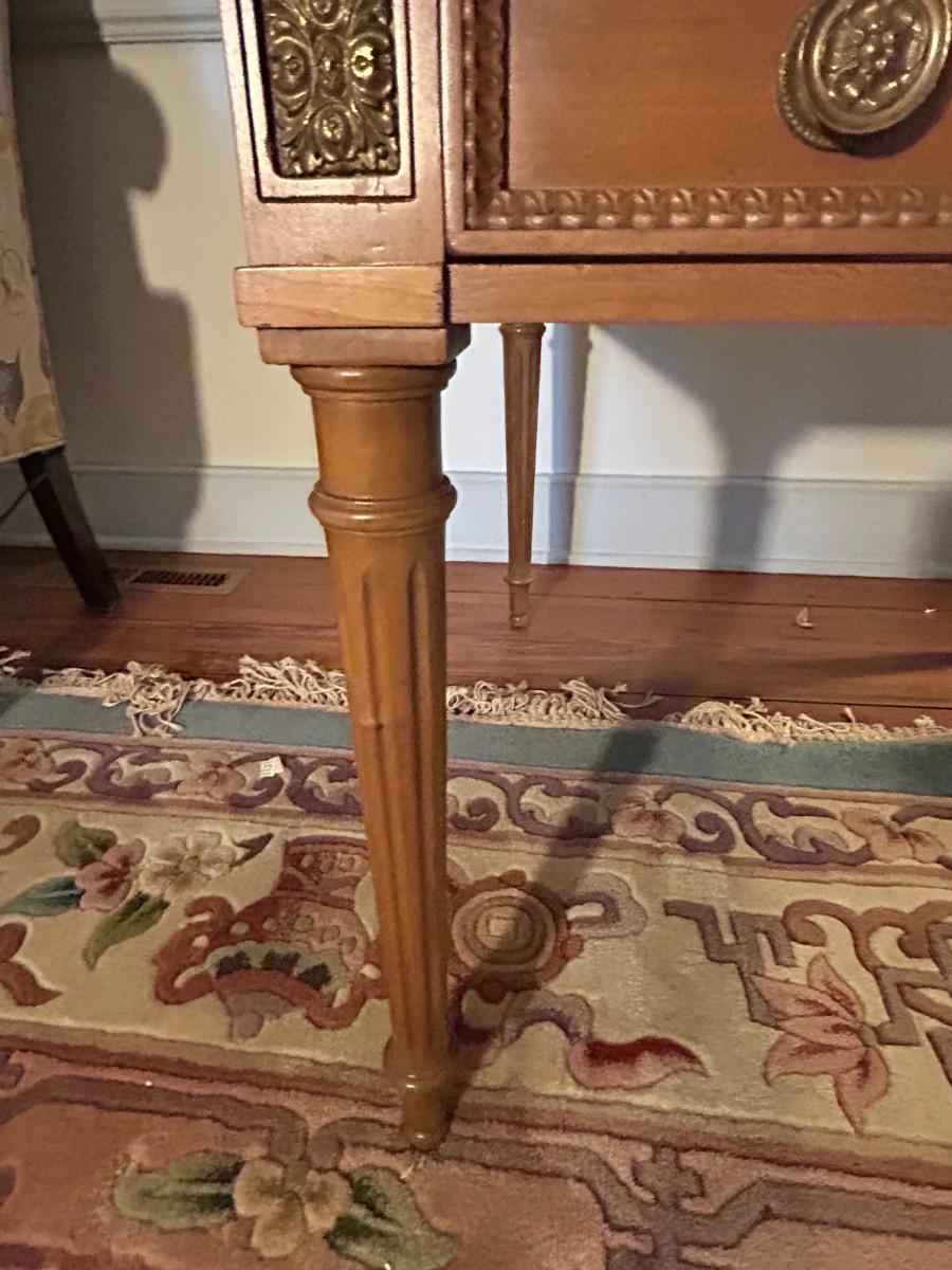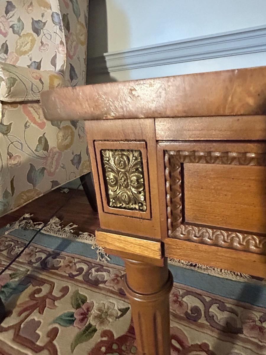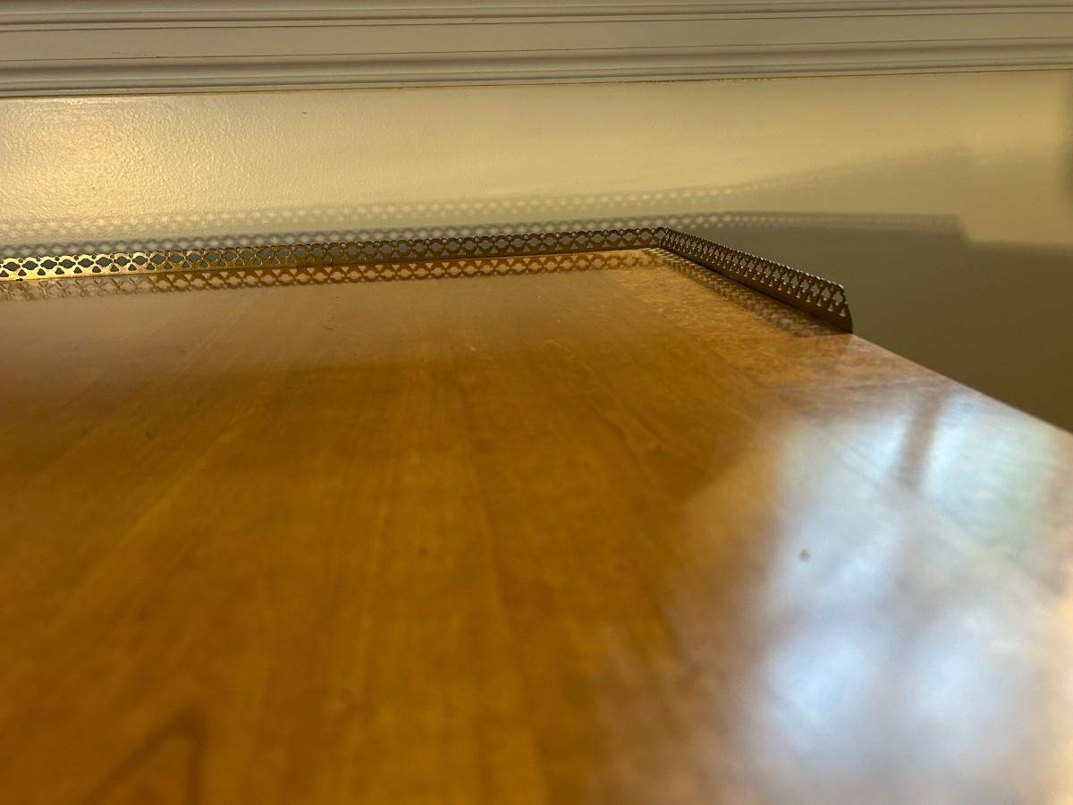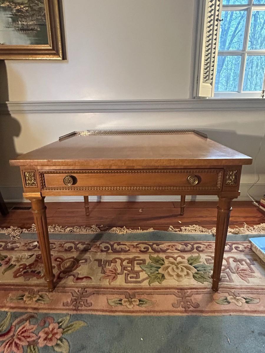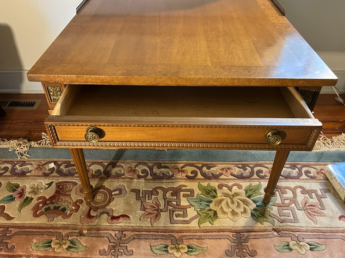 Vintage table measures 22hx30wx30d with a metal accent piece is in excellent condition. Drawer provides a safe place to hide remotes, chargers, all the things they didn't have when this piece was crafted.
