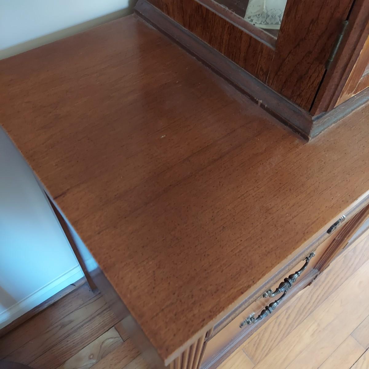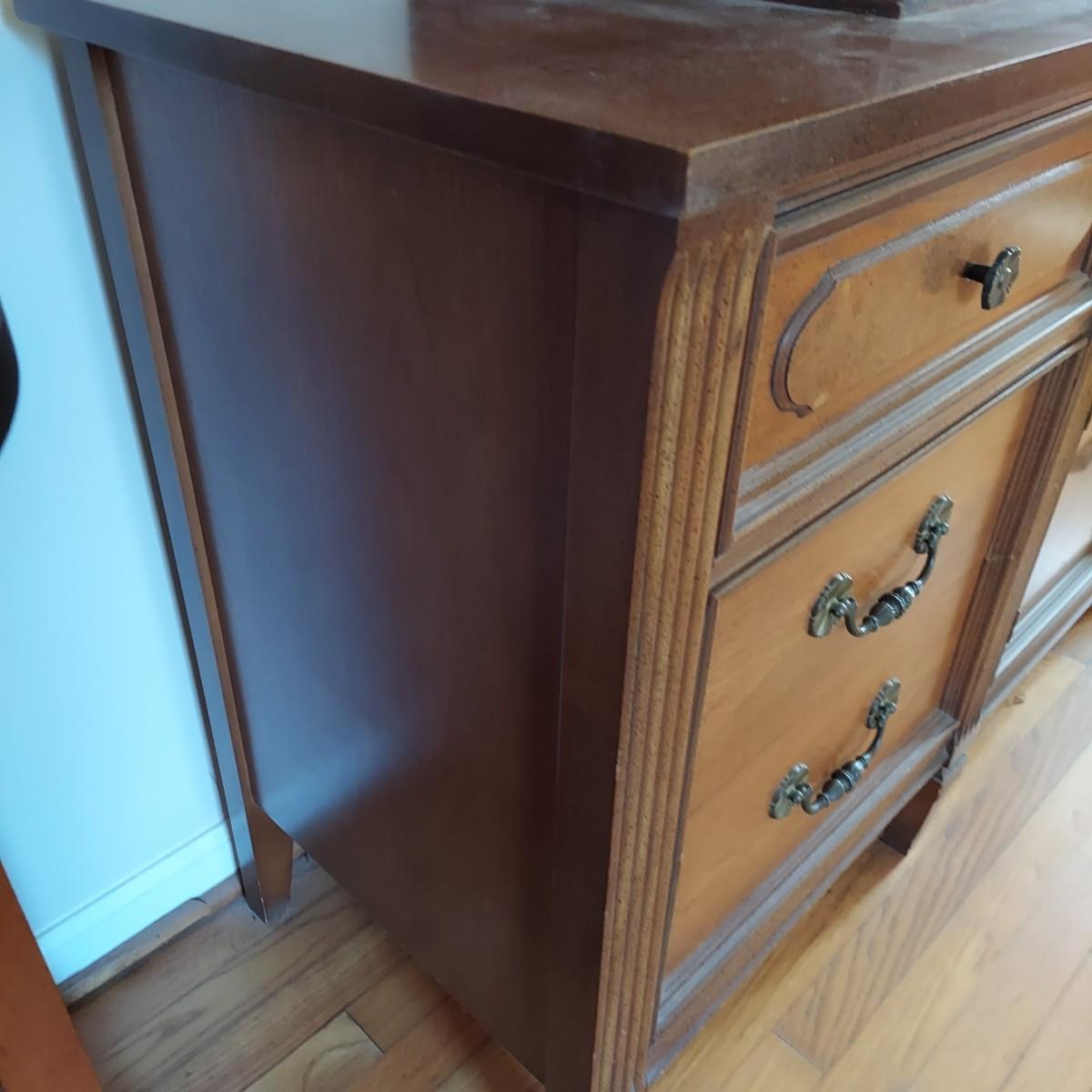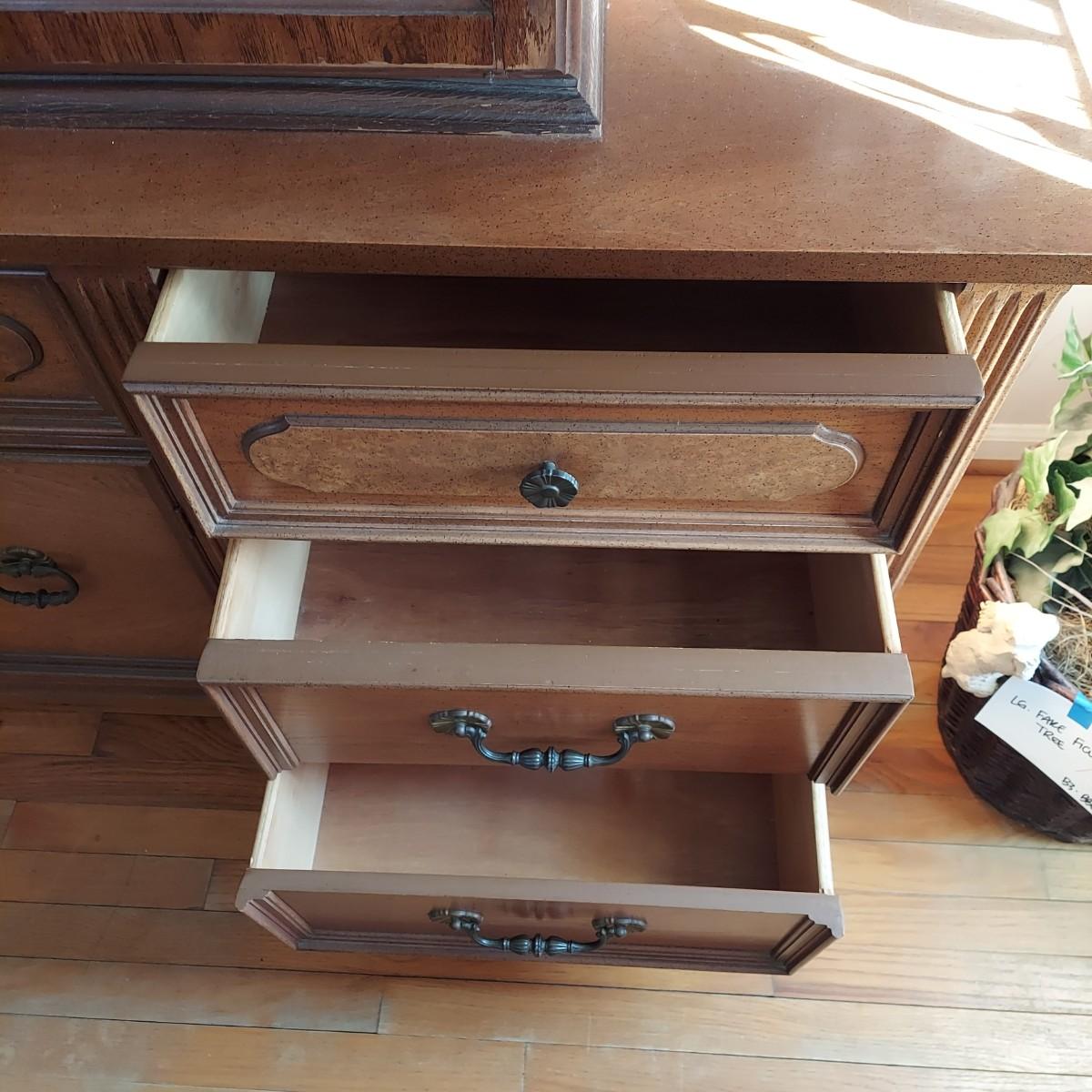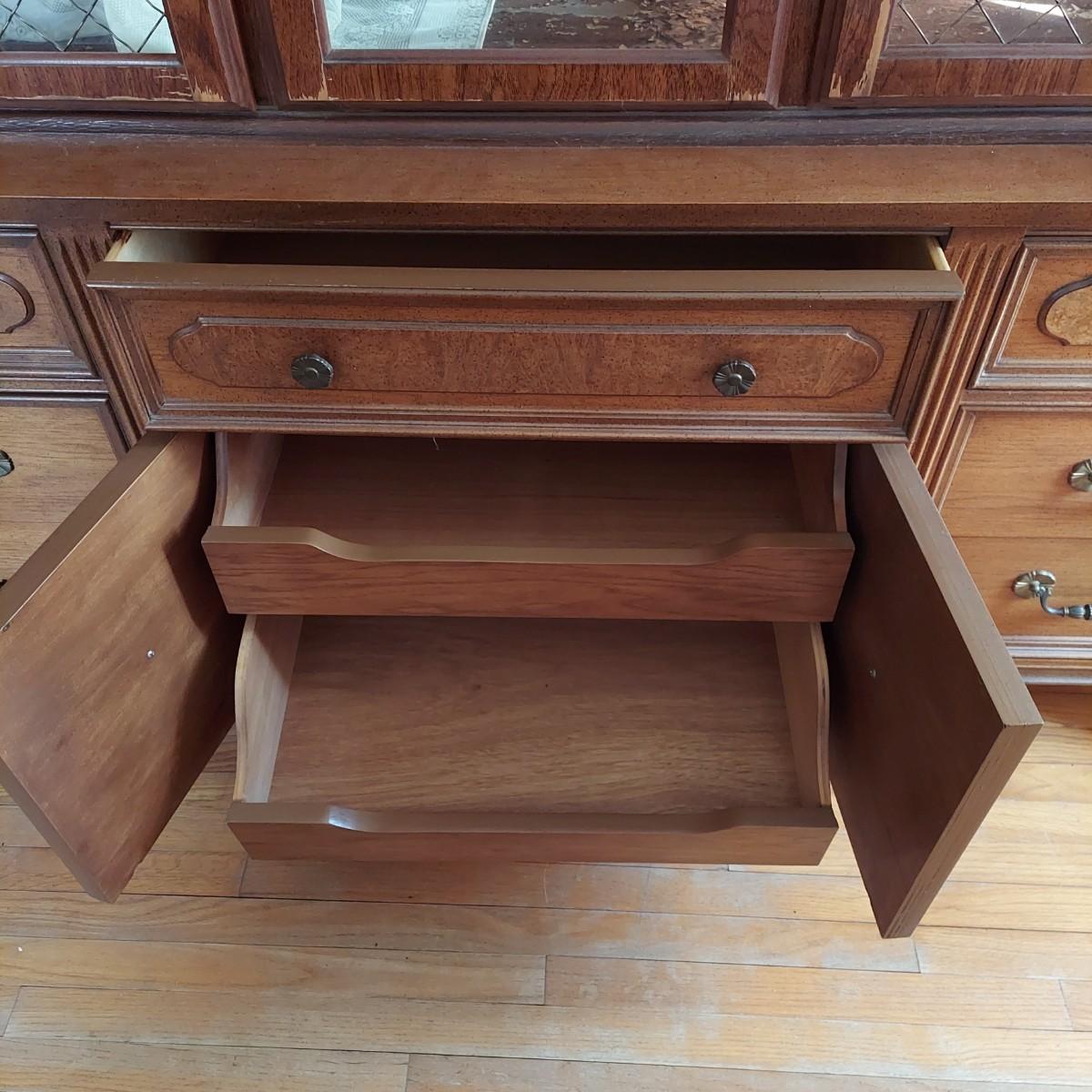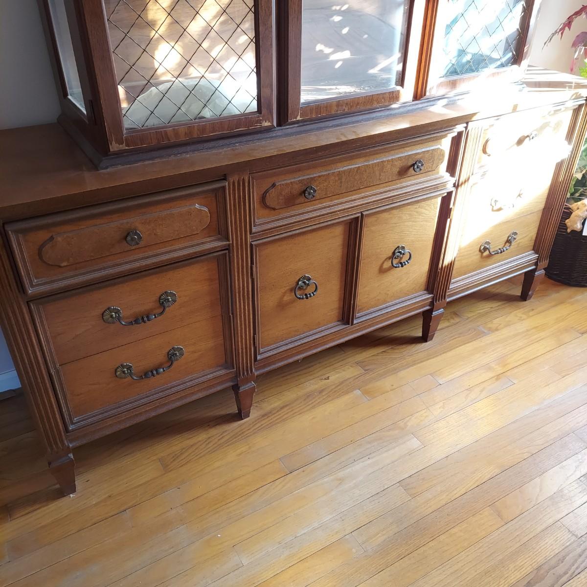Large vintage sideboard cabinet with several drawers. This is a large piece that can be stacked with the China hutch shown in photos. Matching hutch, chest on chest style dresser and a pair of nightstands are for sale in other lots. This bottom piece measures 74” x 18.5” x 32.5"H. Please see photos for details. Local Pickup Only