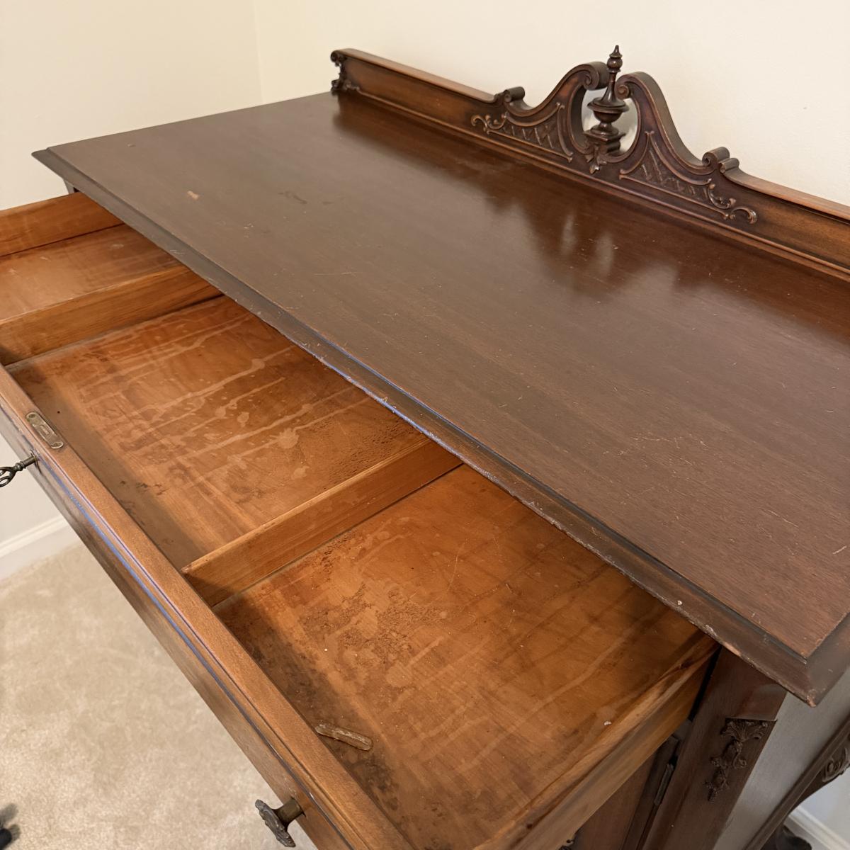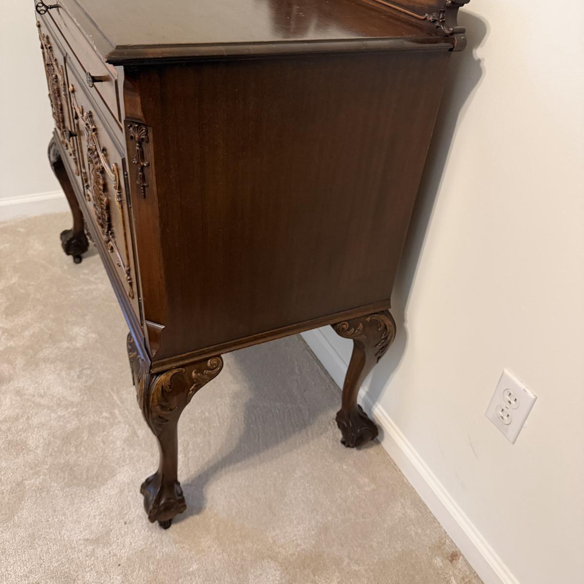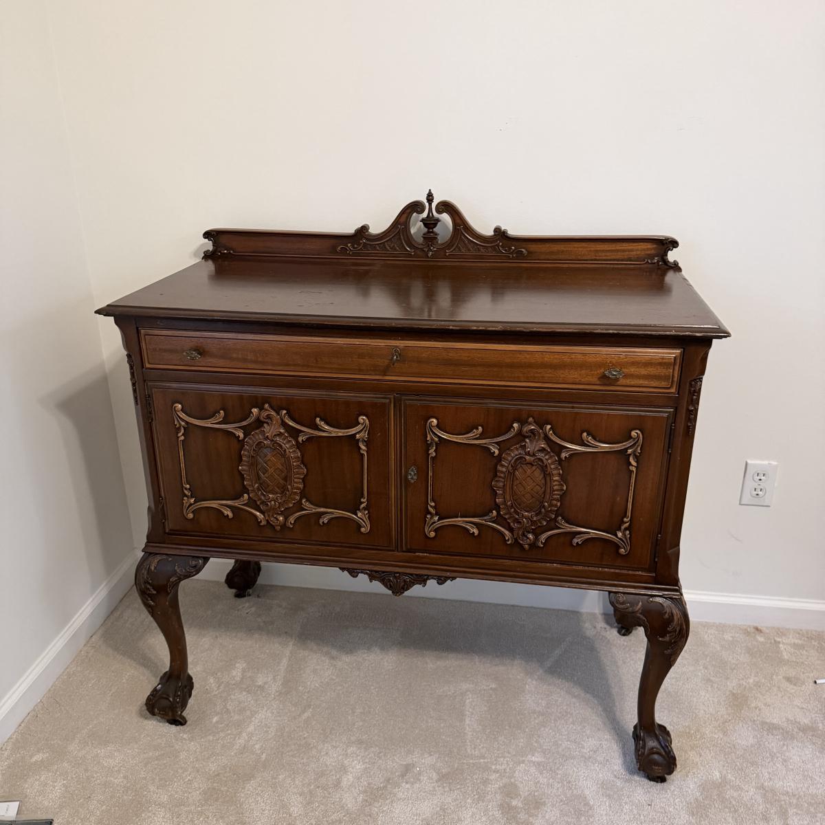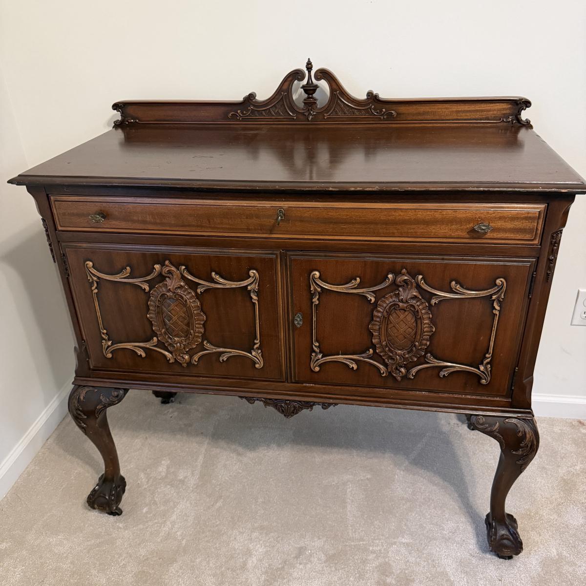 This vintage sideboard has a dovetailed drawer with key and a cabinet underneath. Sideboard has claw feet with casters and intricate carved wood embellishments. Piece measures 40” x 19” x 40”H. Piece has some scratches and nicks and one cabinet is missing a screw to hold on a piece of metal, see pictures.