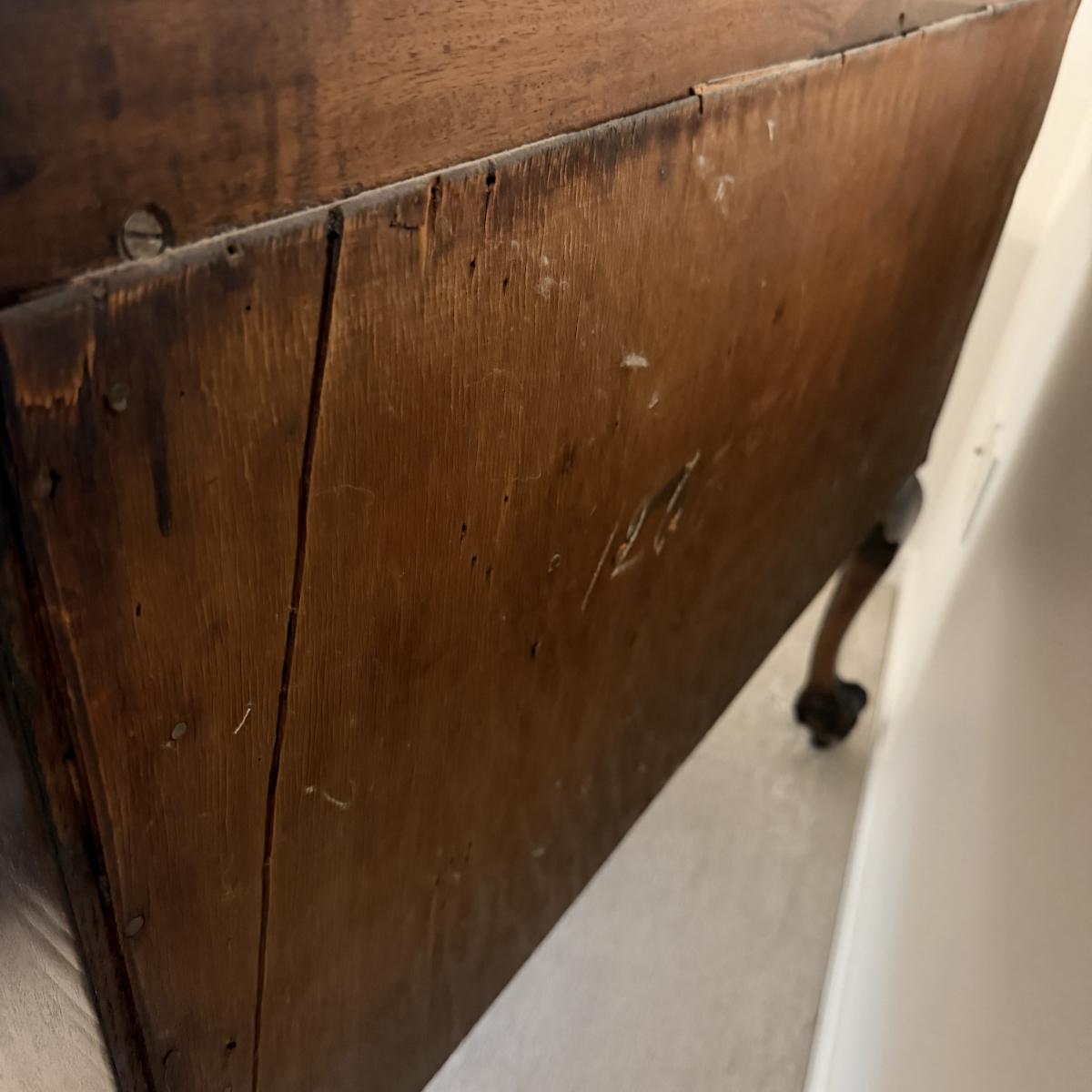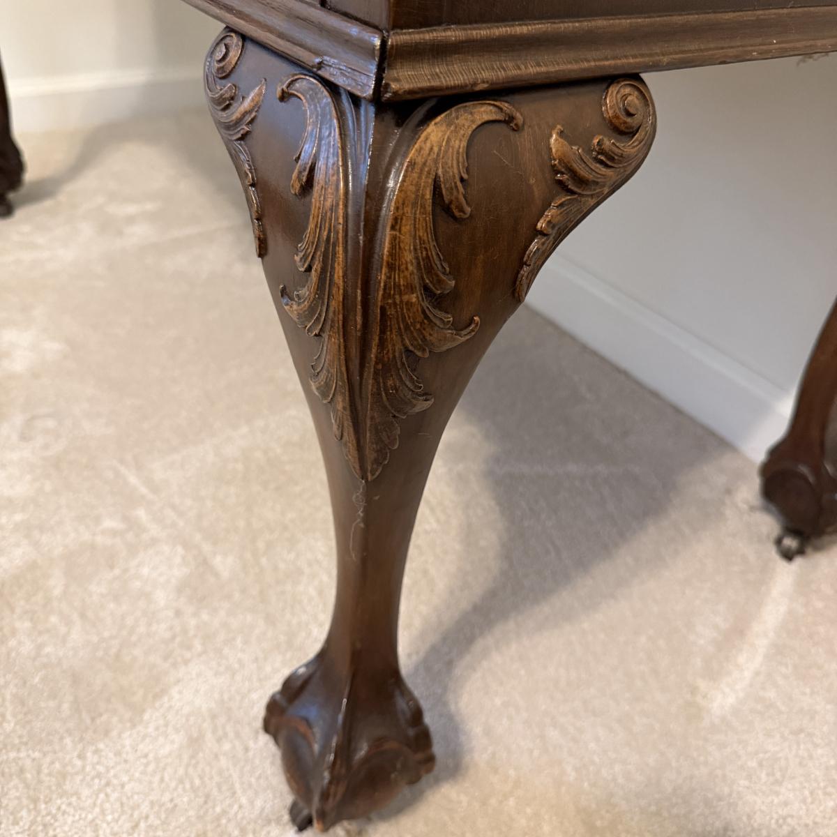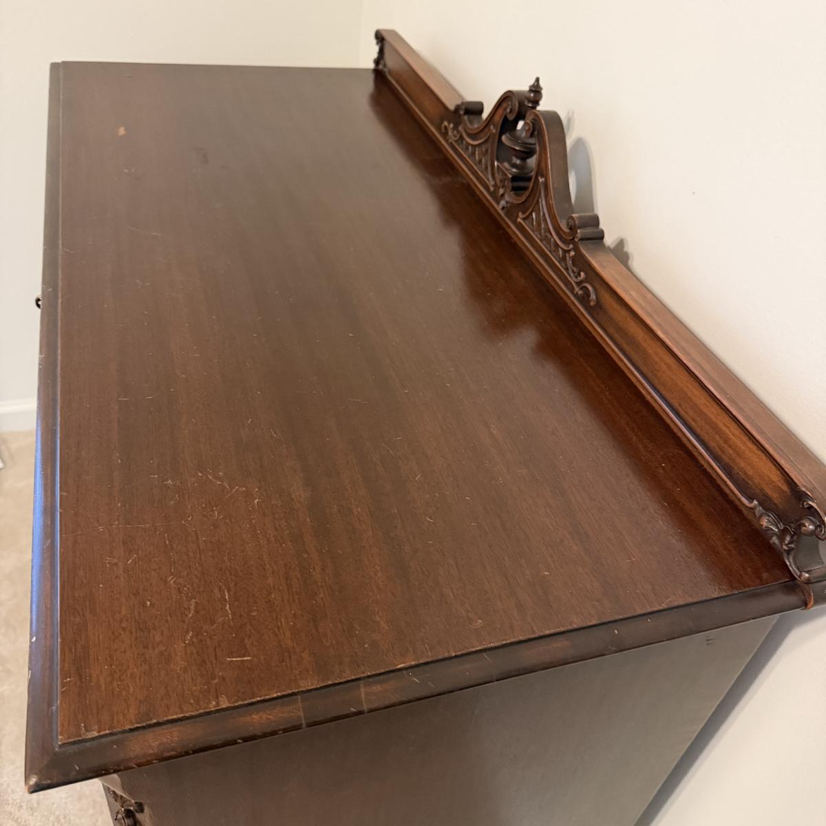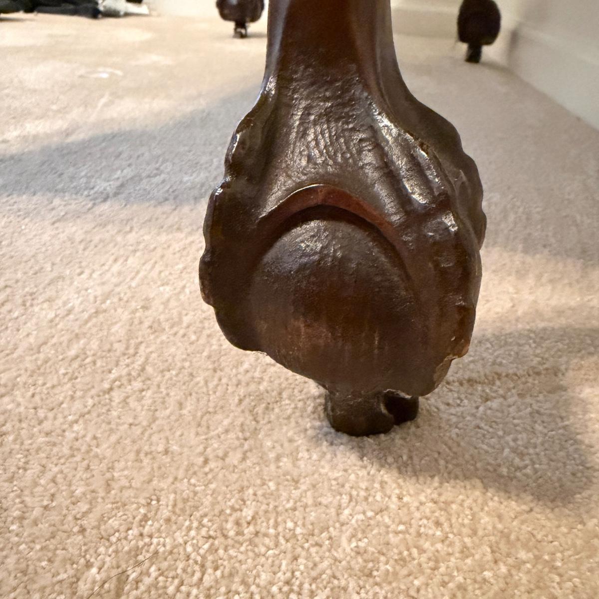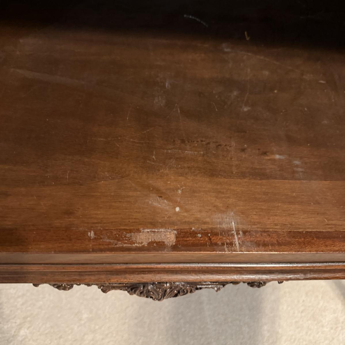 This vintage sideboard has a dovetailed drawer with key and a cabinet underneath. Sideboard has claw feet with casters and intricate carved wood embellishments. Piece measures 40” x 19” x 40”H. Piece has some scratches and nicks and one cabinet is missing a screw to hold on a piece of metal, see pictures.