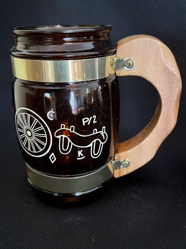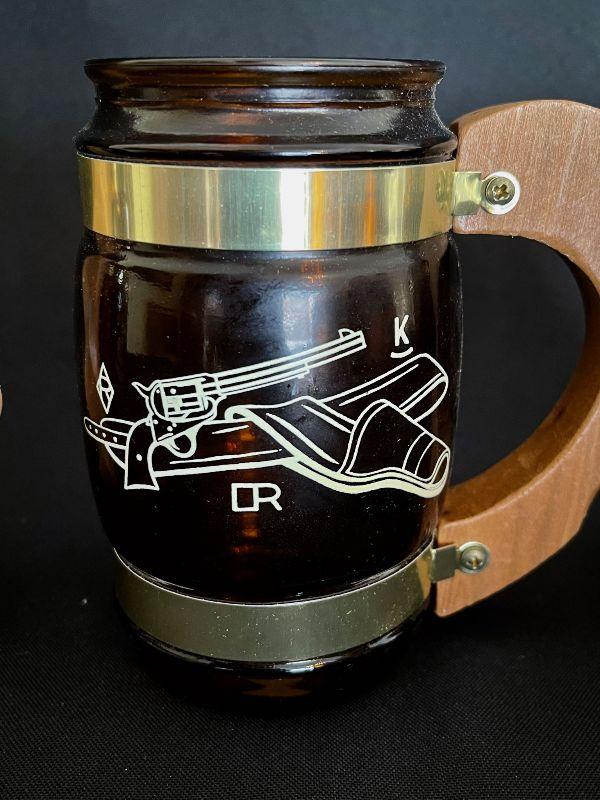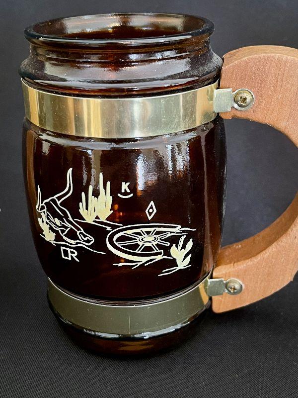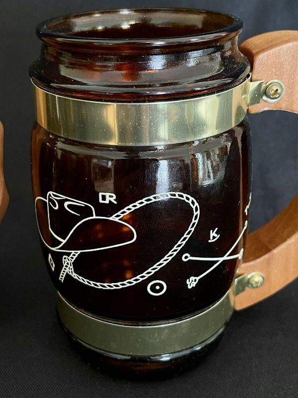 Fun and funky vintage Siesta brand Western Cowboy Glass Brass Steins