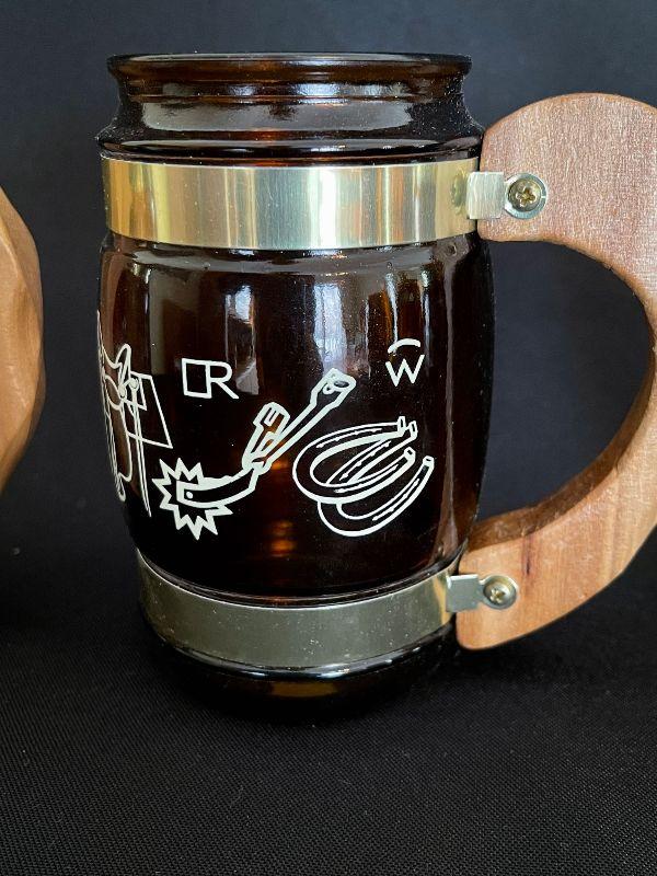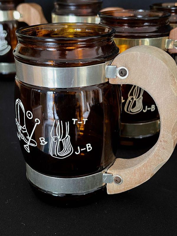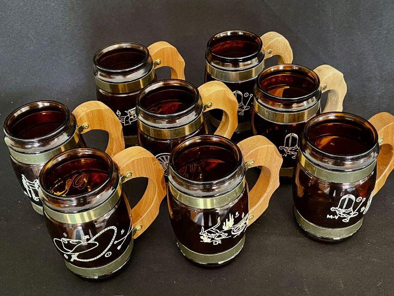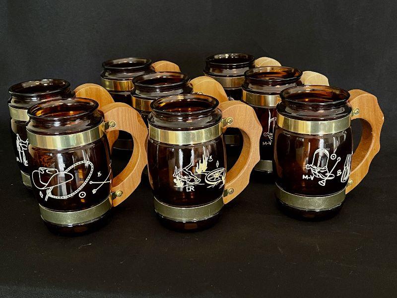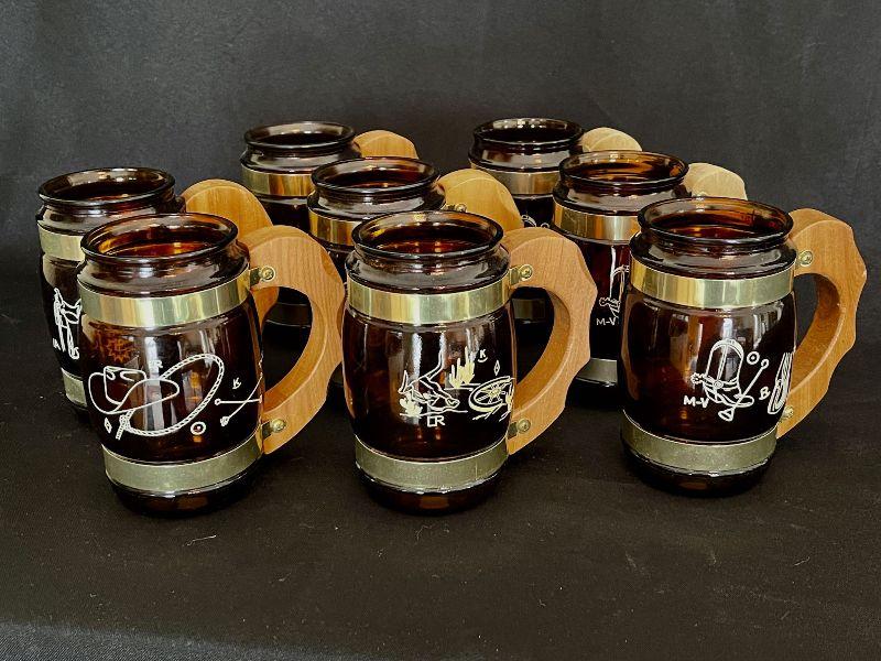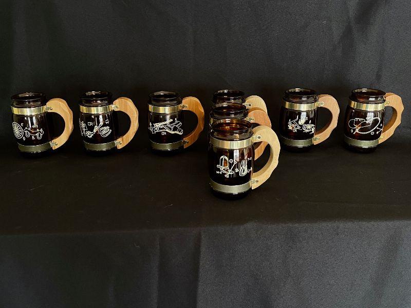 Set of 8 glass and brass beer steins with wood handles. There are 6 different designs represented. One design repeats 3x.