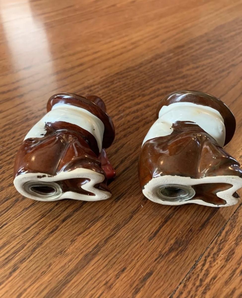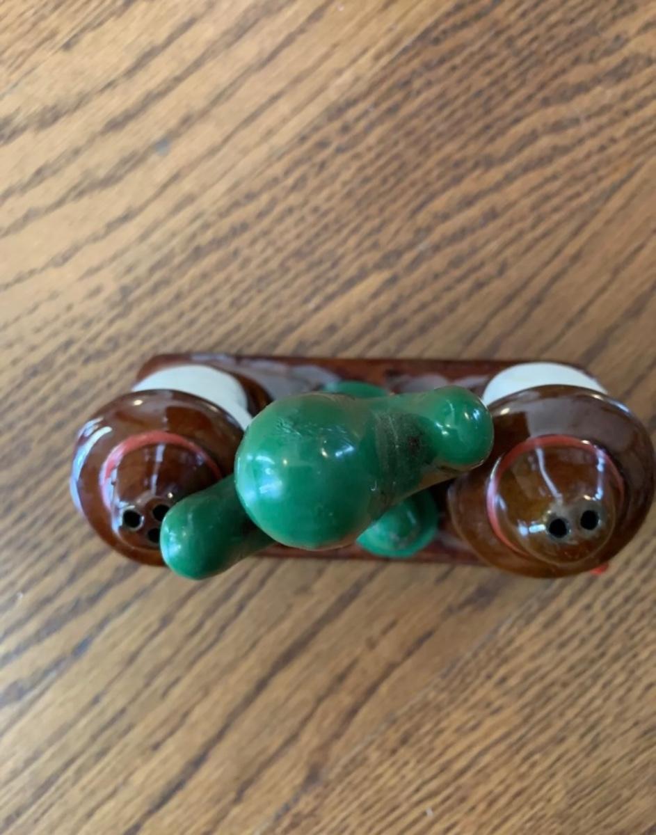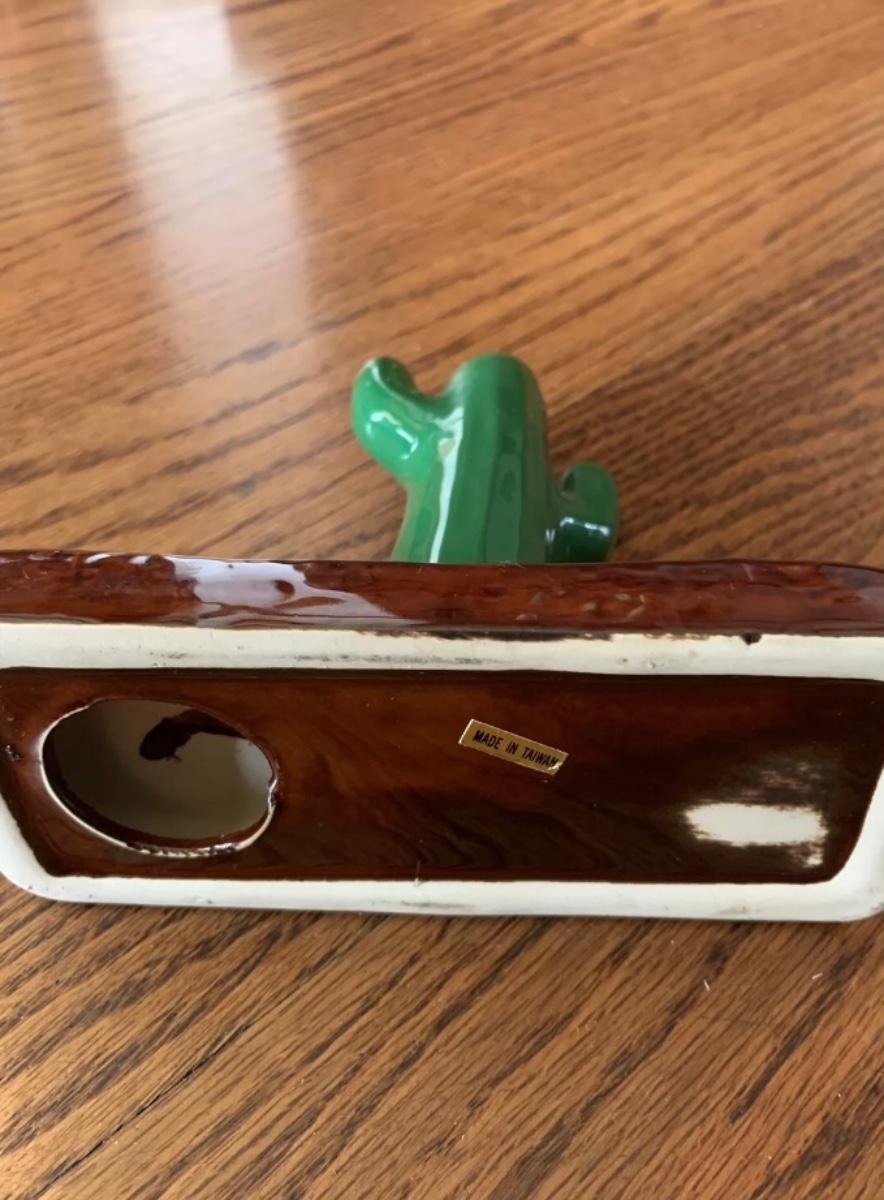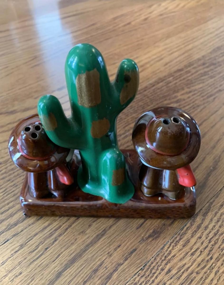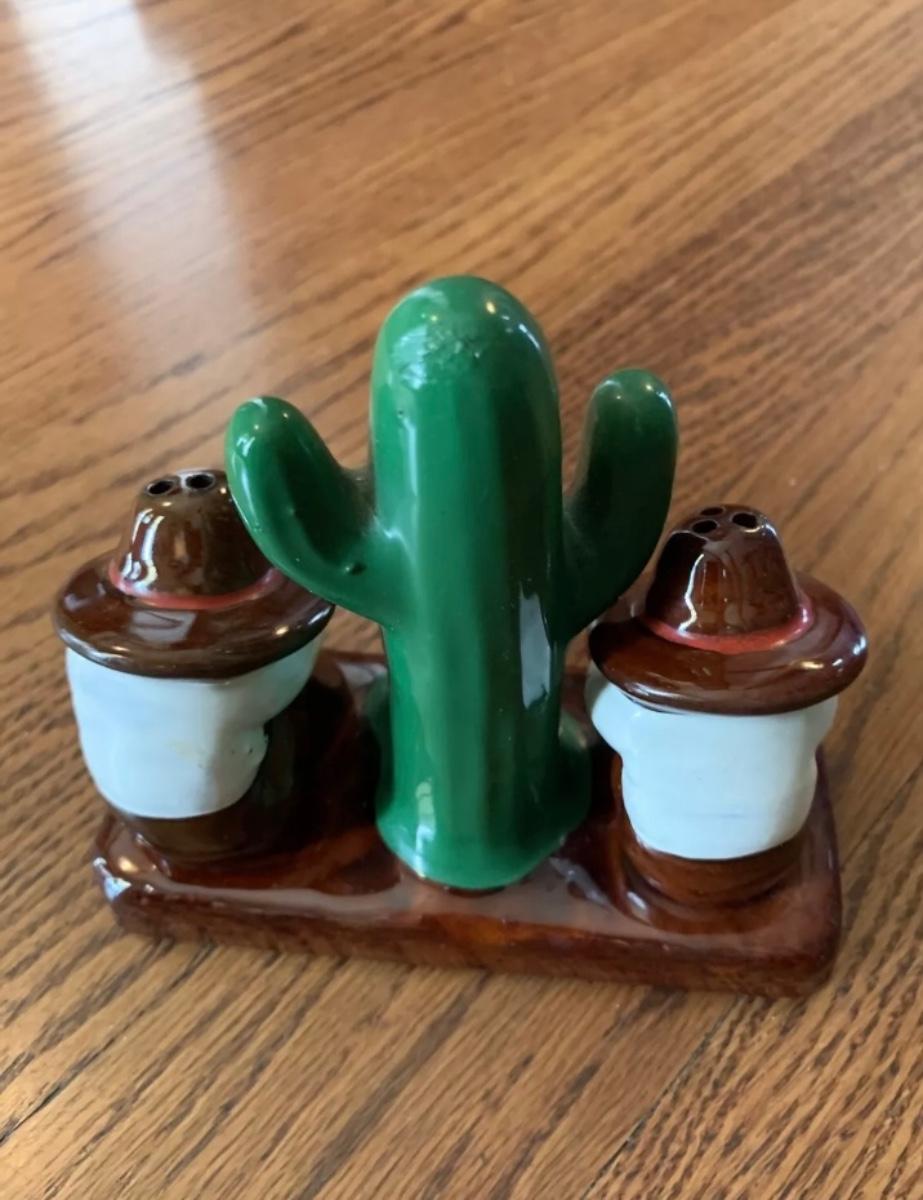 Vintage siesta sombrero/green cactus salt and pepper shaker set, 5”H