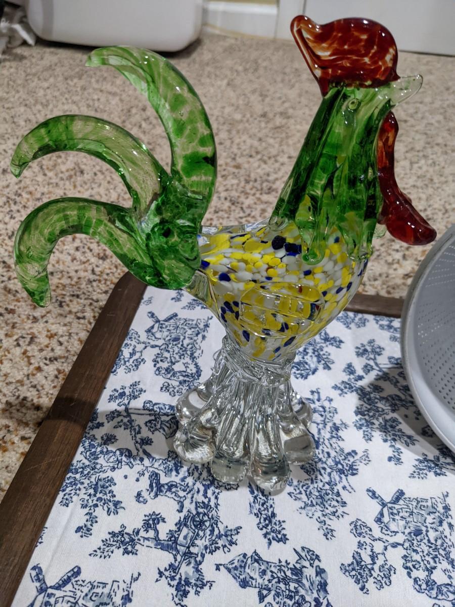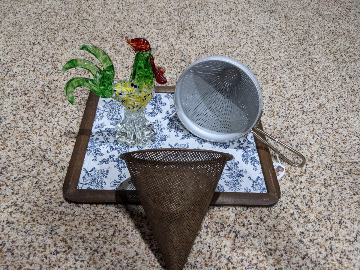 2 sieves- one with handle. Great for hanging plants. Heavy glass rooster.