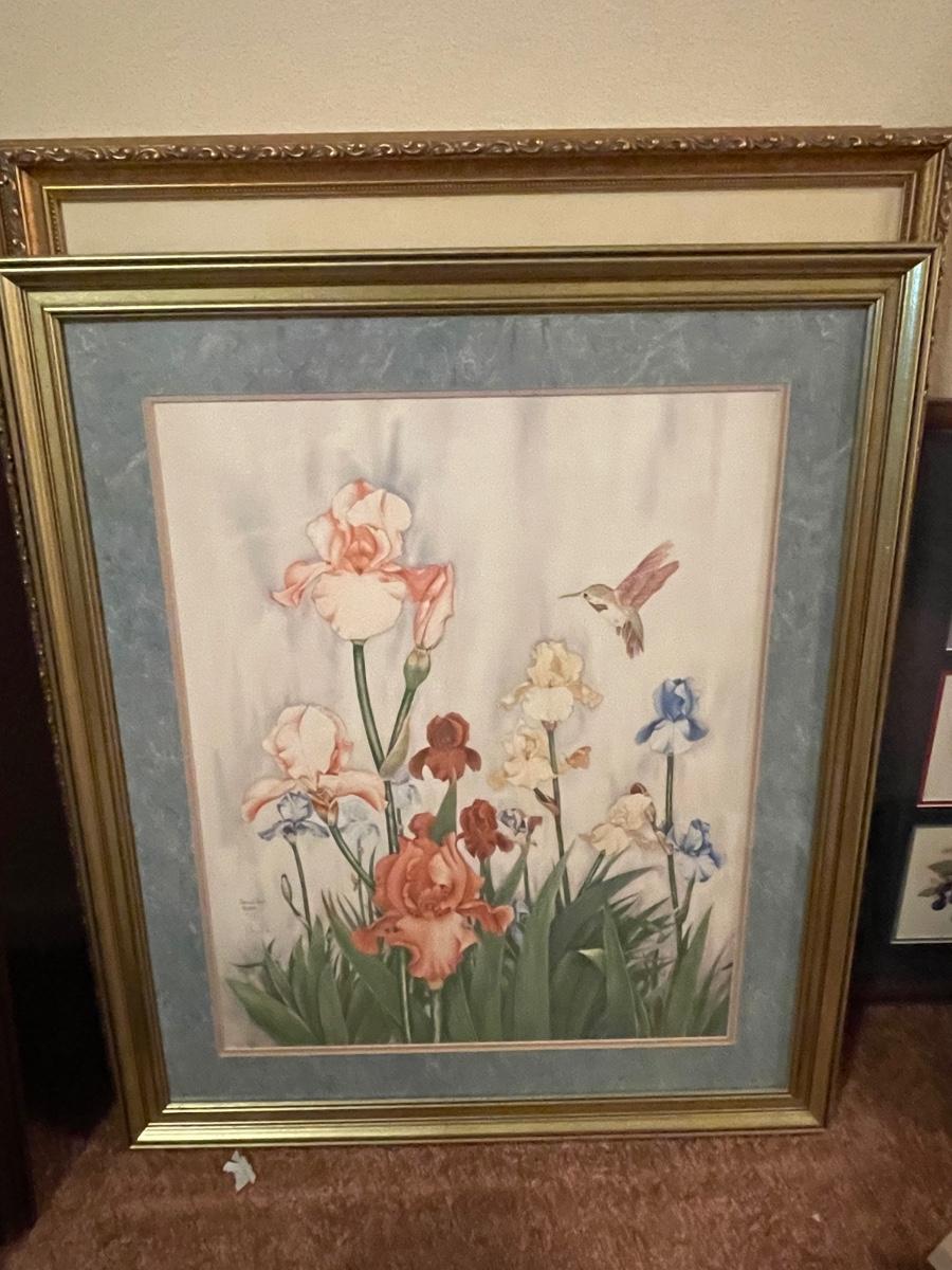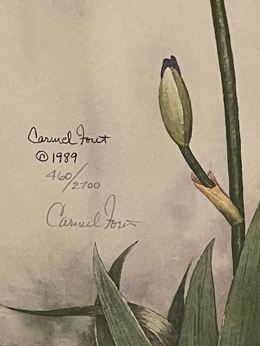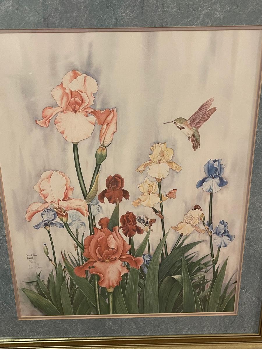 Vintage Signed and Numbered Carmel Foret "Iris Flowers Hummingbird" Picture