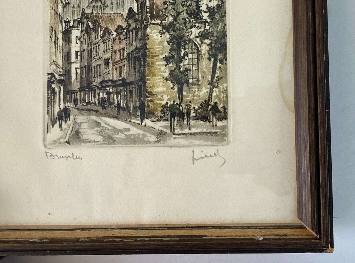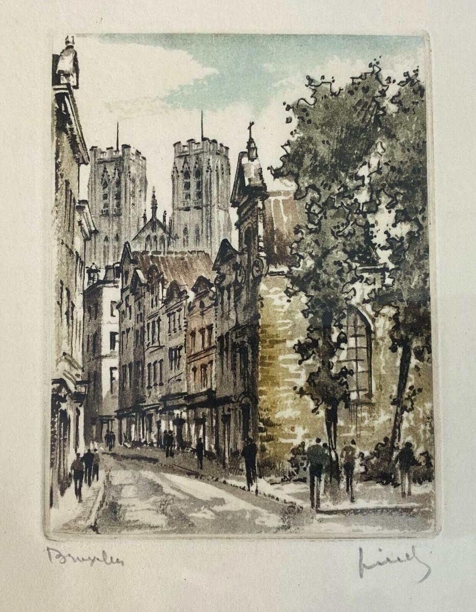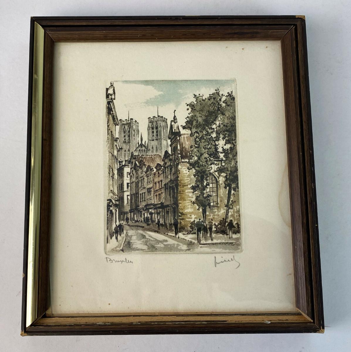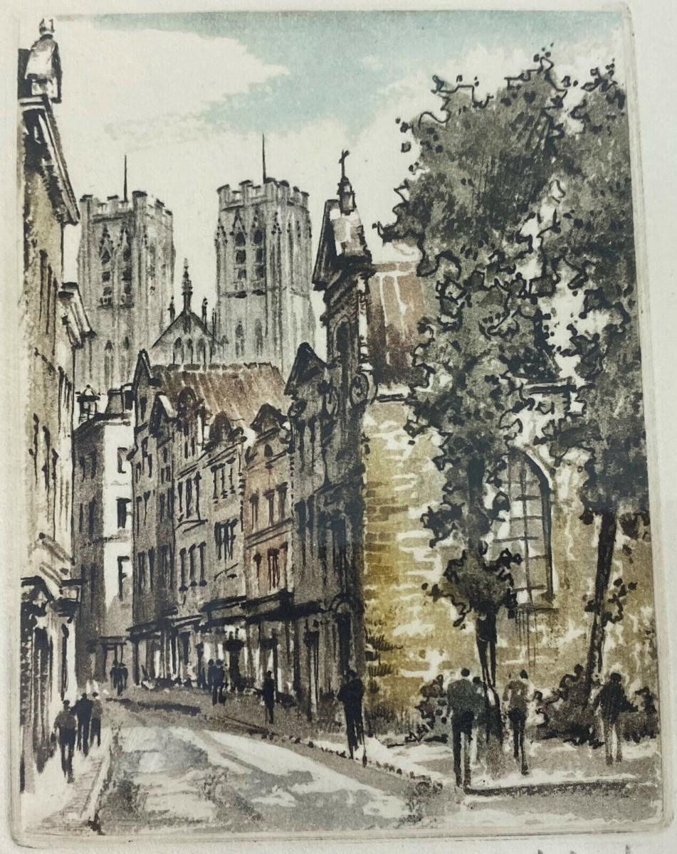 vintage SIGNED COLORED ETCHING EUROPEAN CITYSCAPE BLOCK PRINT