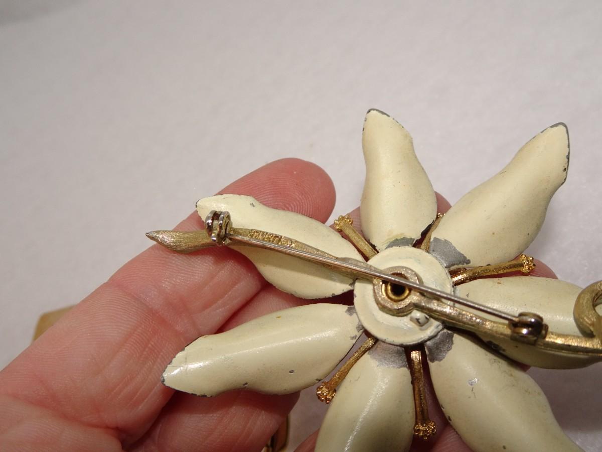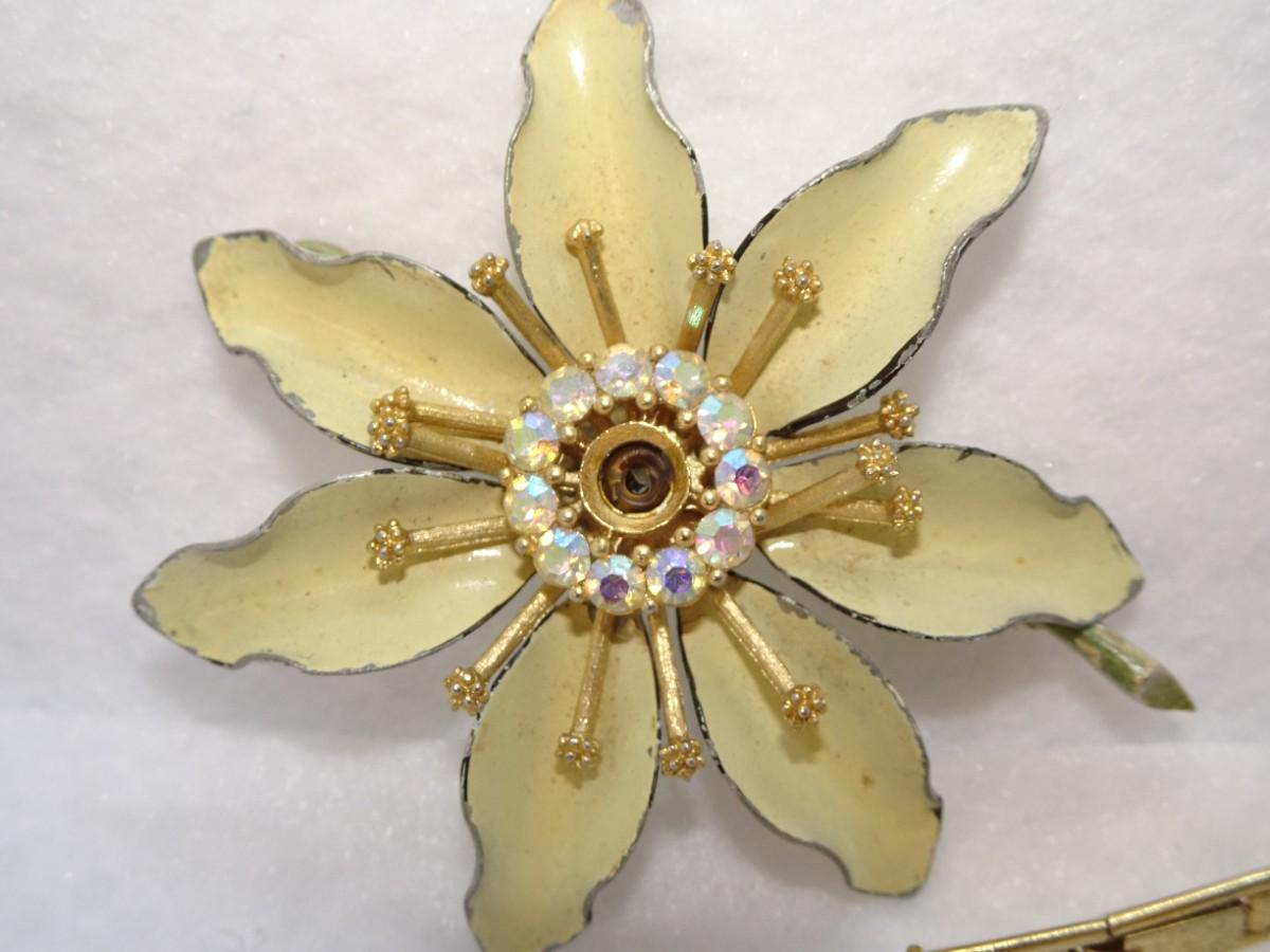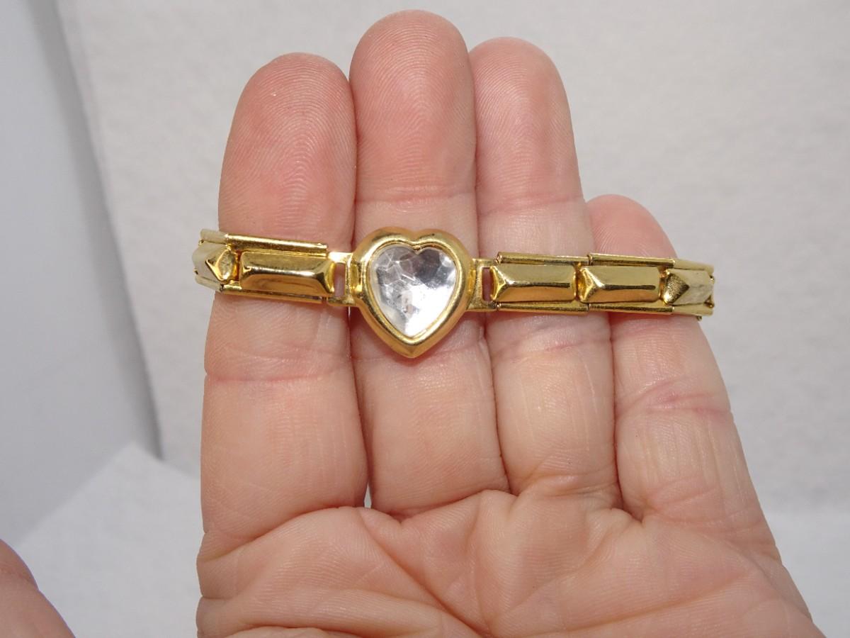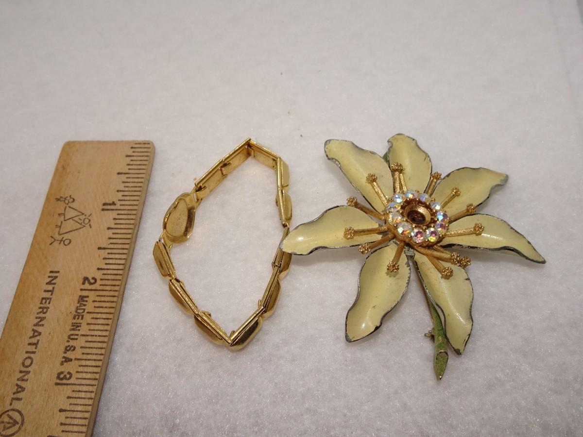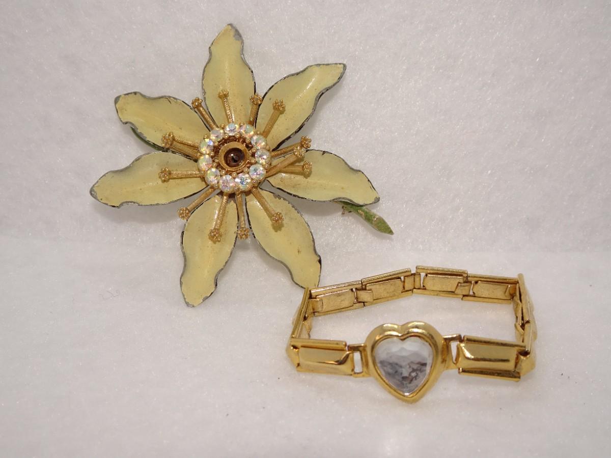 Vintage Signed Flower Pin, Stretch Gold Tone Heart Bracelet