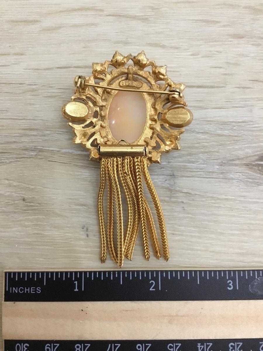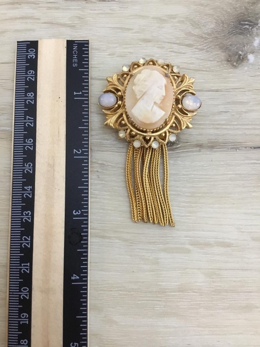 Vintage signed Geno ,high end, gorgeous carved shell cameo brooch, moonstone, opal brooch