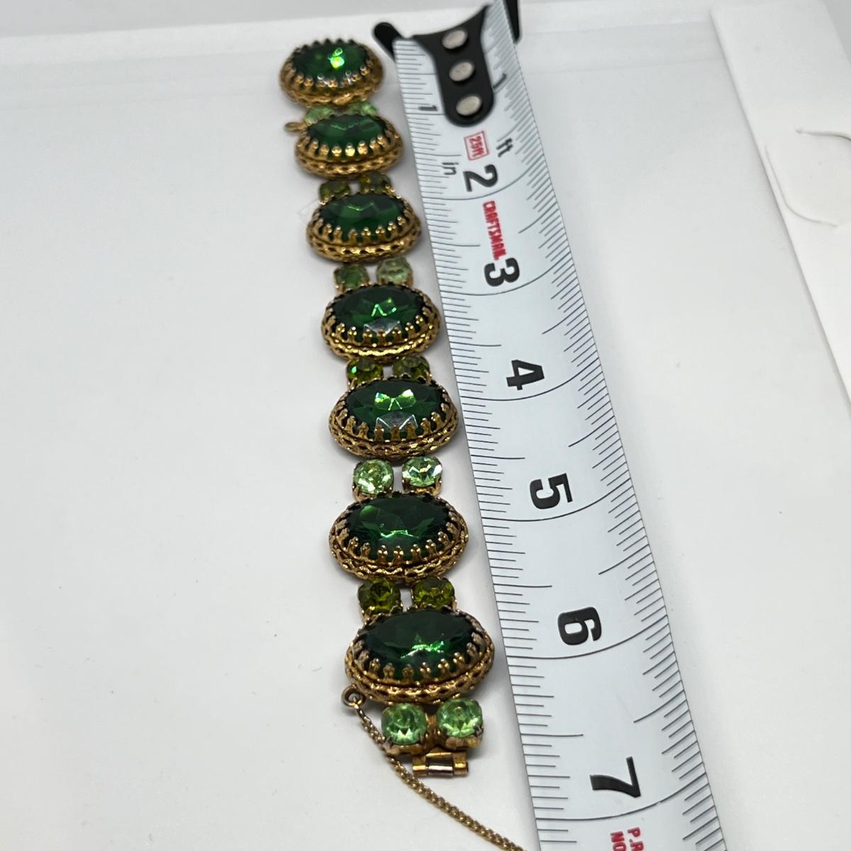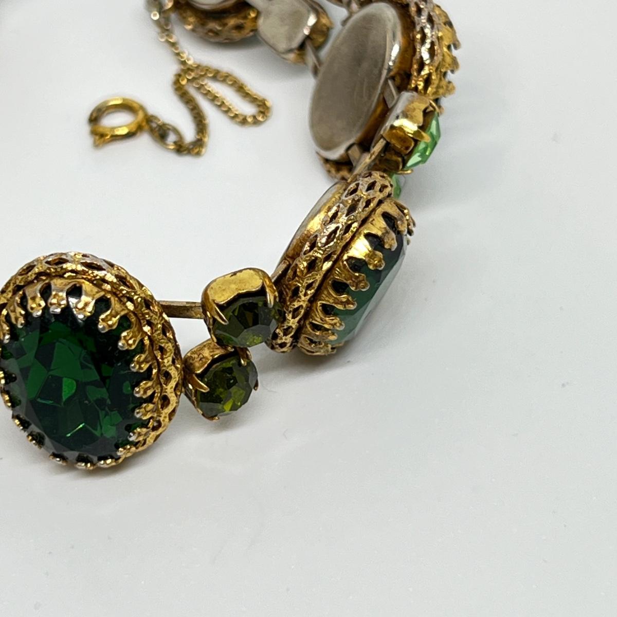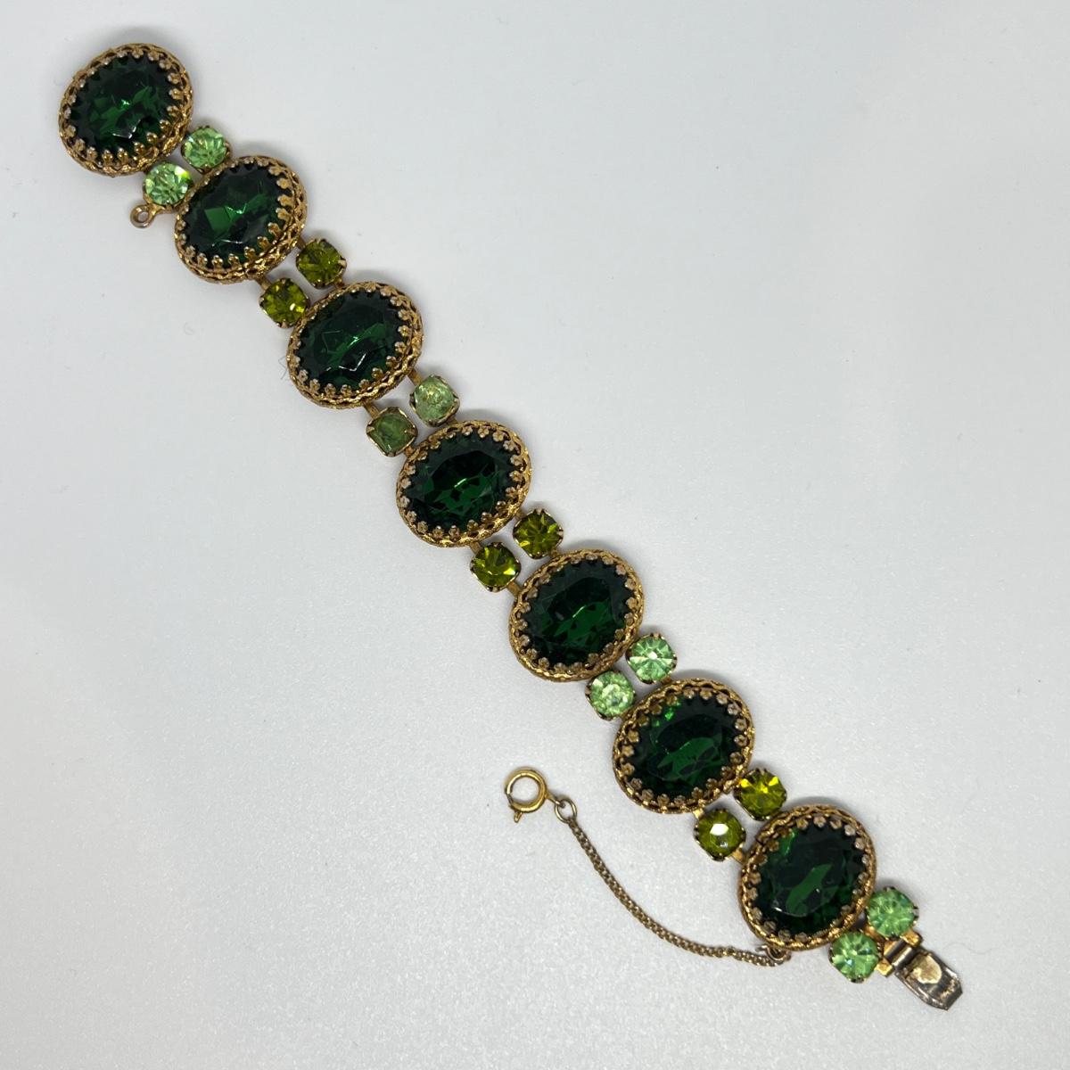 This is a gorgeous vintage designer costume piece by Regency with green rhinestone bracelet and a safety clasp. 2 of the light green stones look to have been replaced.