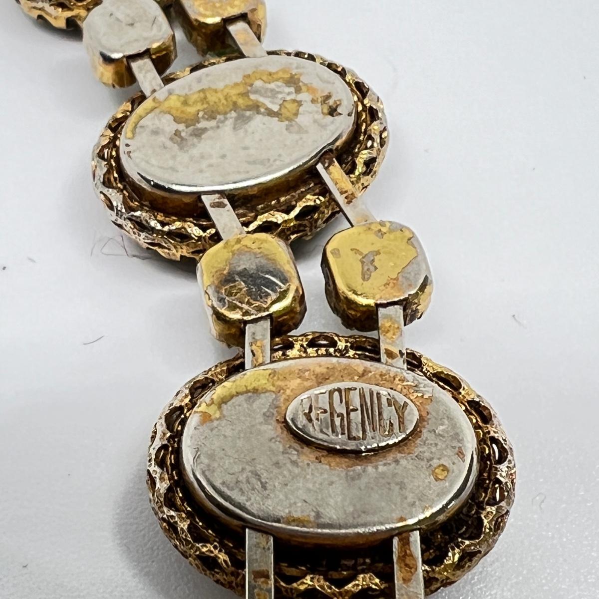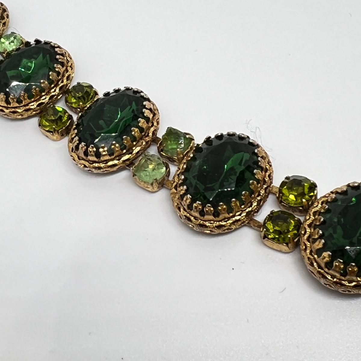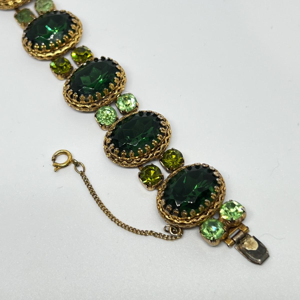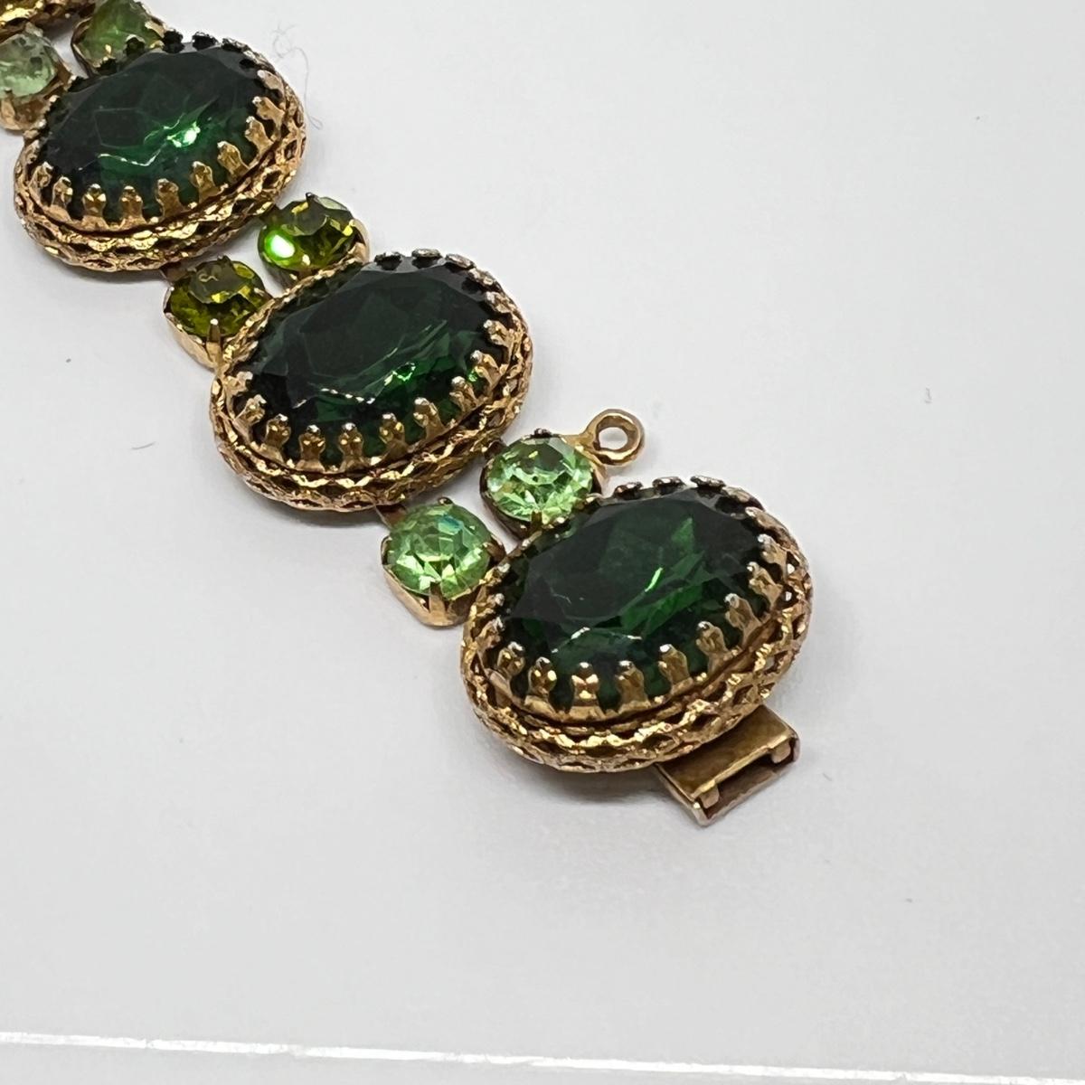 This is a gorgeous vintage designer costume piece by Regency with green rhinestone bracelet and a safety clasp. 2 of the light green stones look to have been replaced.