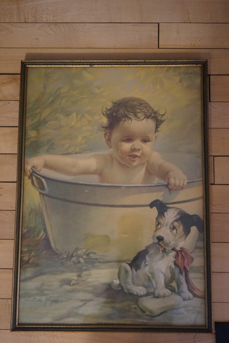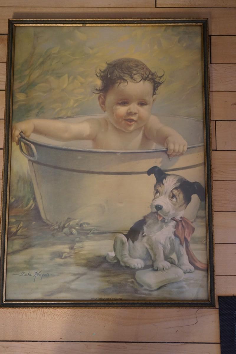 It is in a vintage frame of simple painted black form. It should be reframed in museum board and a better frame to show this very adorable illustration.