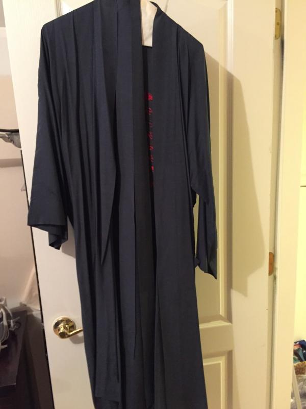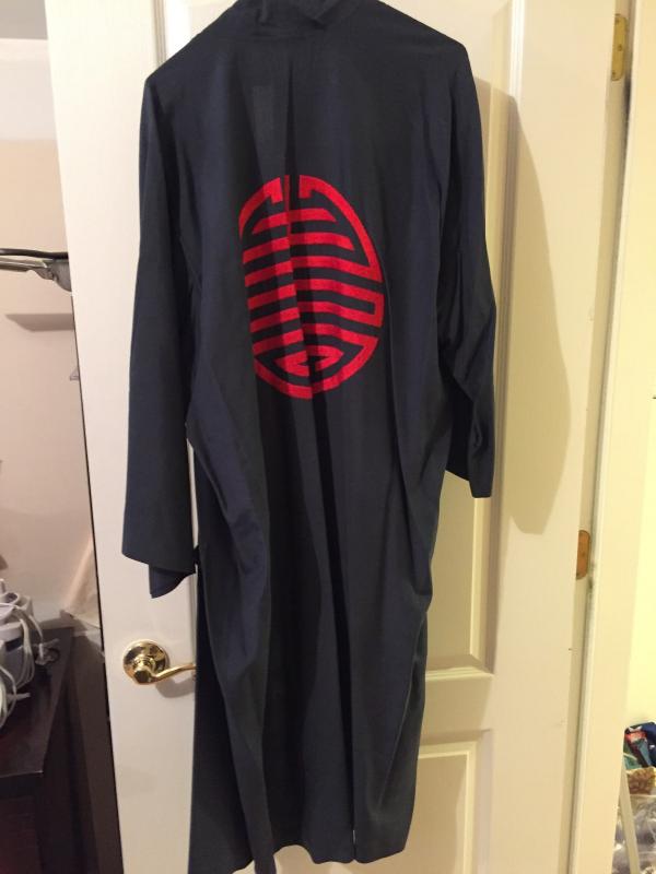 Navy silk robe with red embroidered emblem on back. Labeled- Dynasty Made for Rogers in the Brittish Colony, Hong Kong