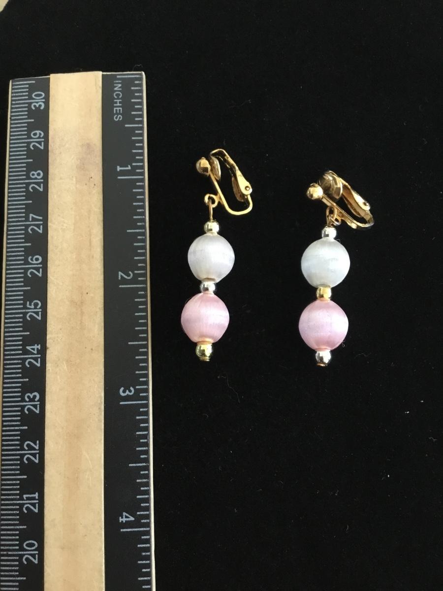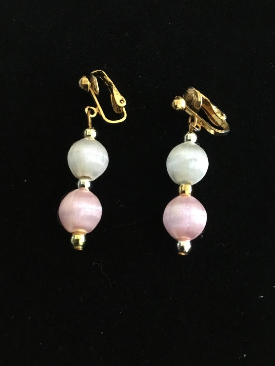 Vintage silk bead, light, pink white gold tone clip on earrings
