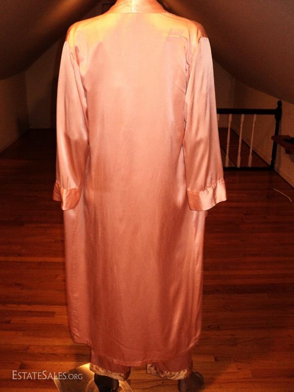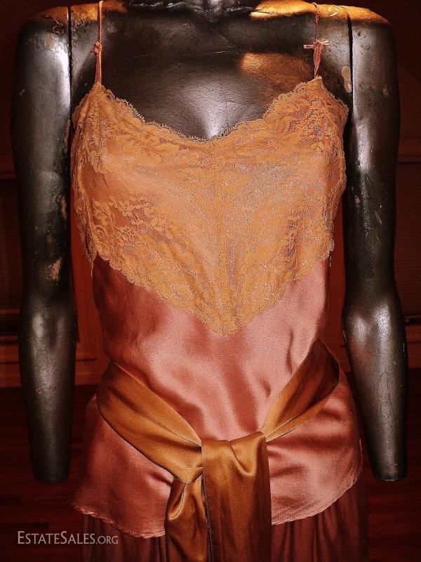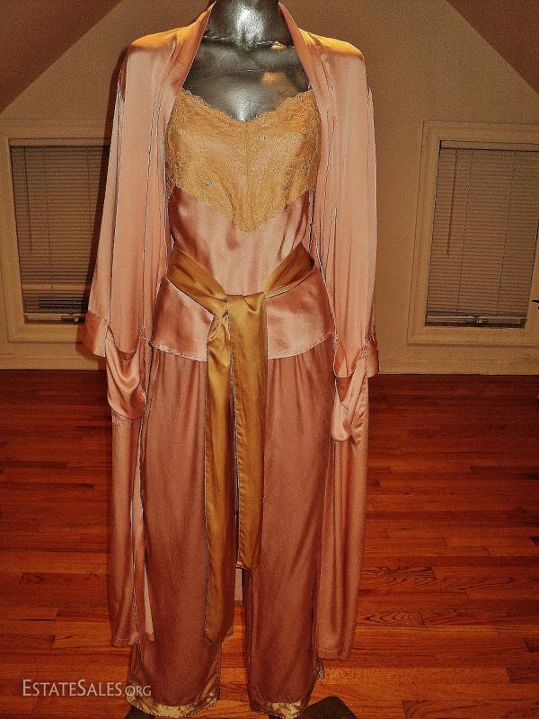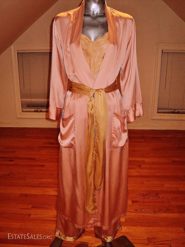 A stunning 3 piece Peignoir set all silk Peau de Soie and antique lace also a sash belt. Gorgeous finish and style some done by hand. In very good vintage condition will need refresh clean for a couple of extremely faded spot