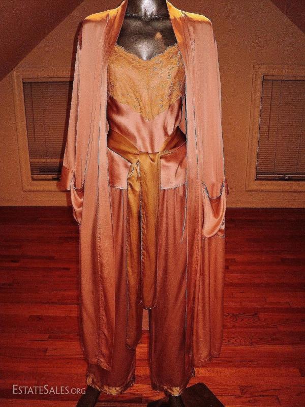 A stunning 3 piece Peignoir set all silk Peau de Soie and antique lace also a sash belt. Gorgeous finish and style some done by hand. In very good vintage condition will need refresh clean for a couple of extremely faded spot