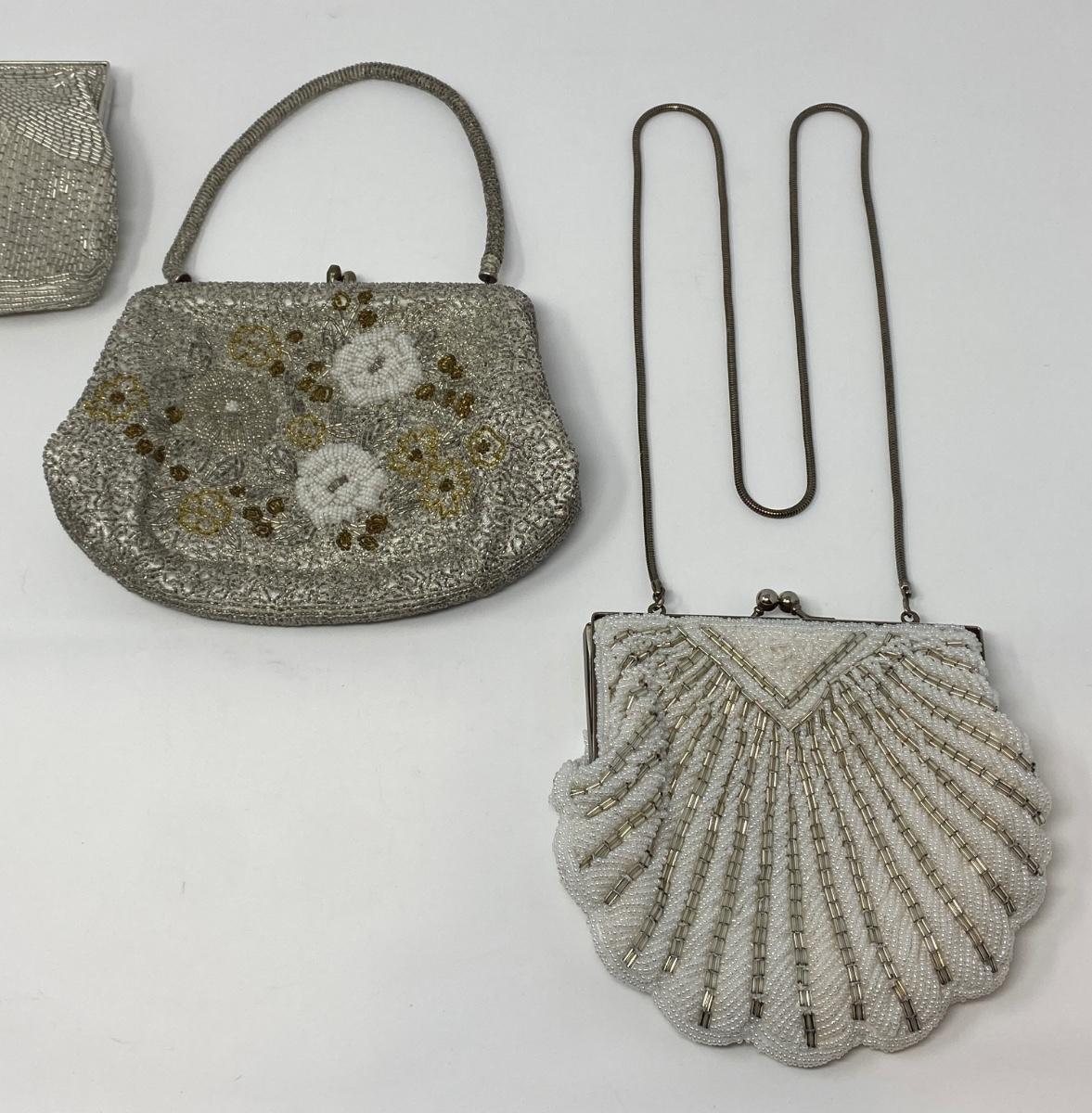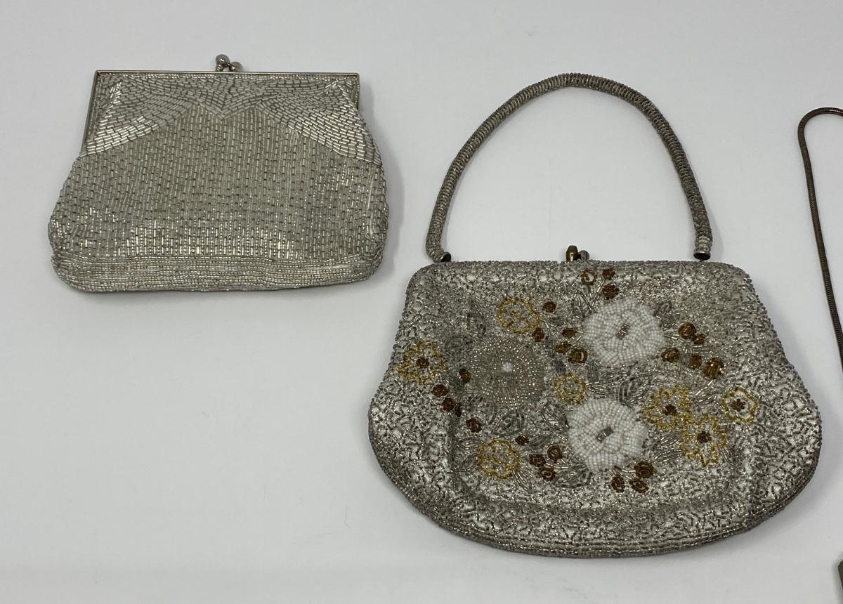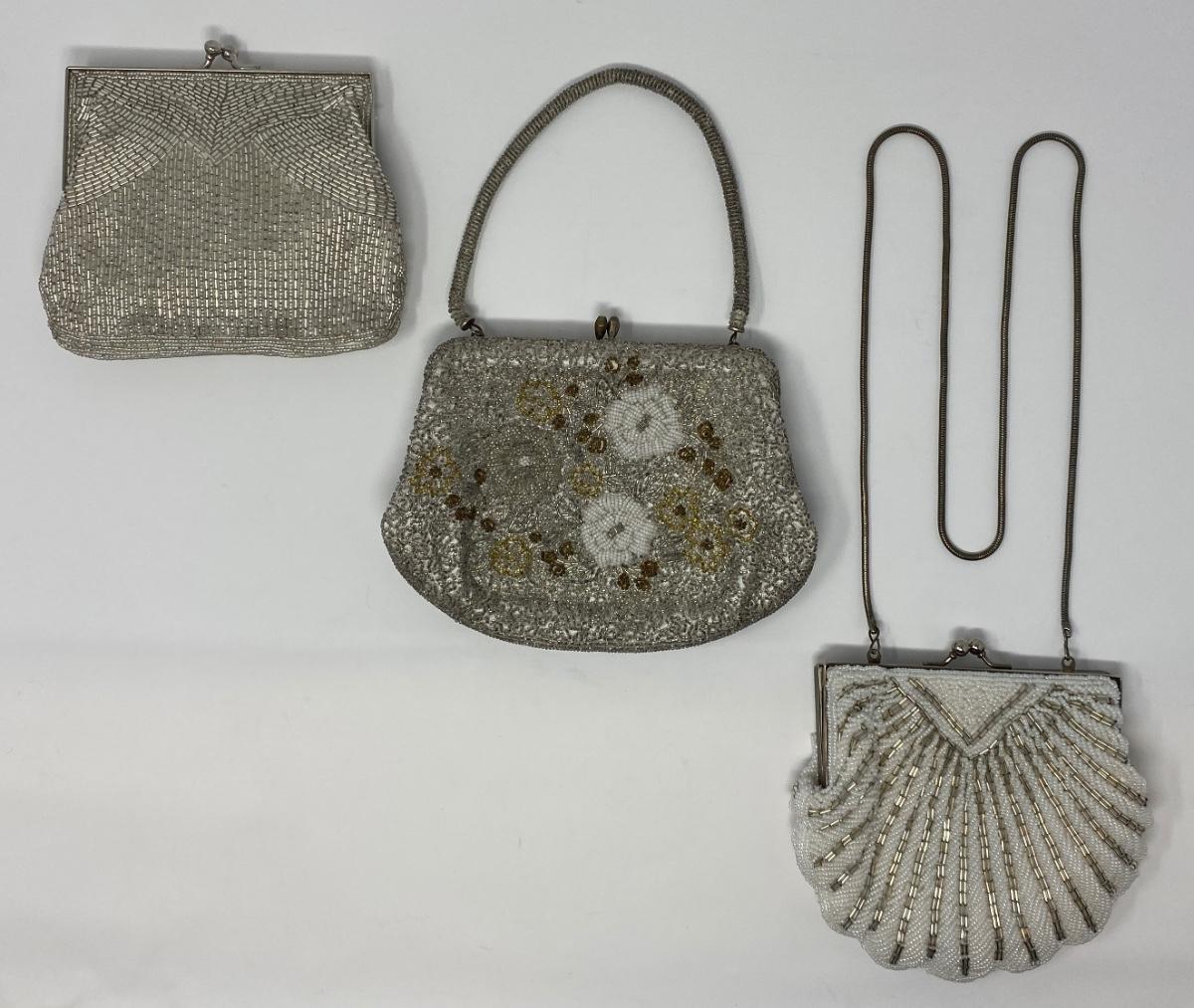 Vintage Silver and Ivory Micro-Bead Clutch, Floral Handbag, and Sequin Purse