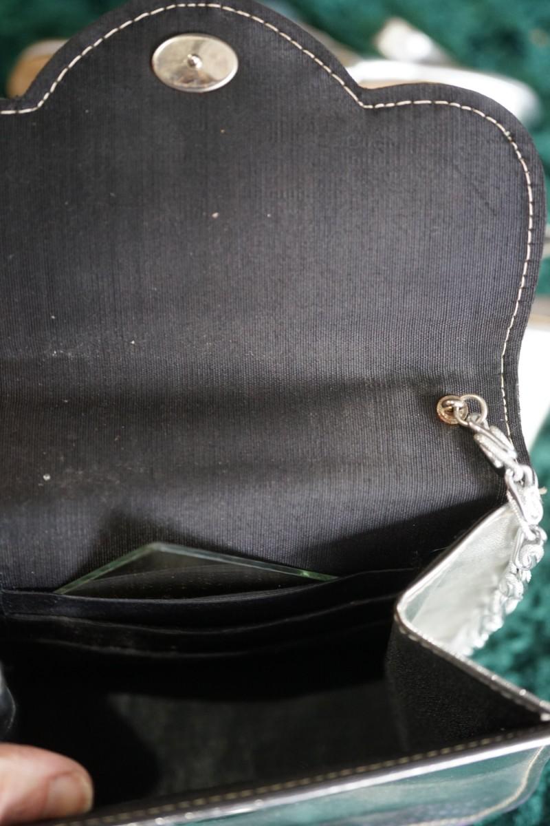vinyl with silver color. interior is black fabric with small pocket mirror in a compartment