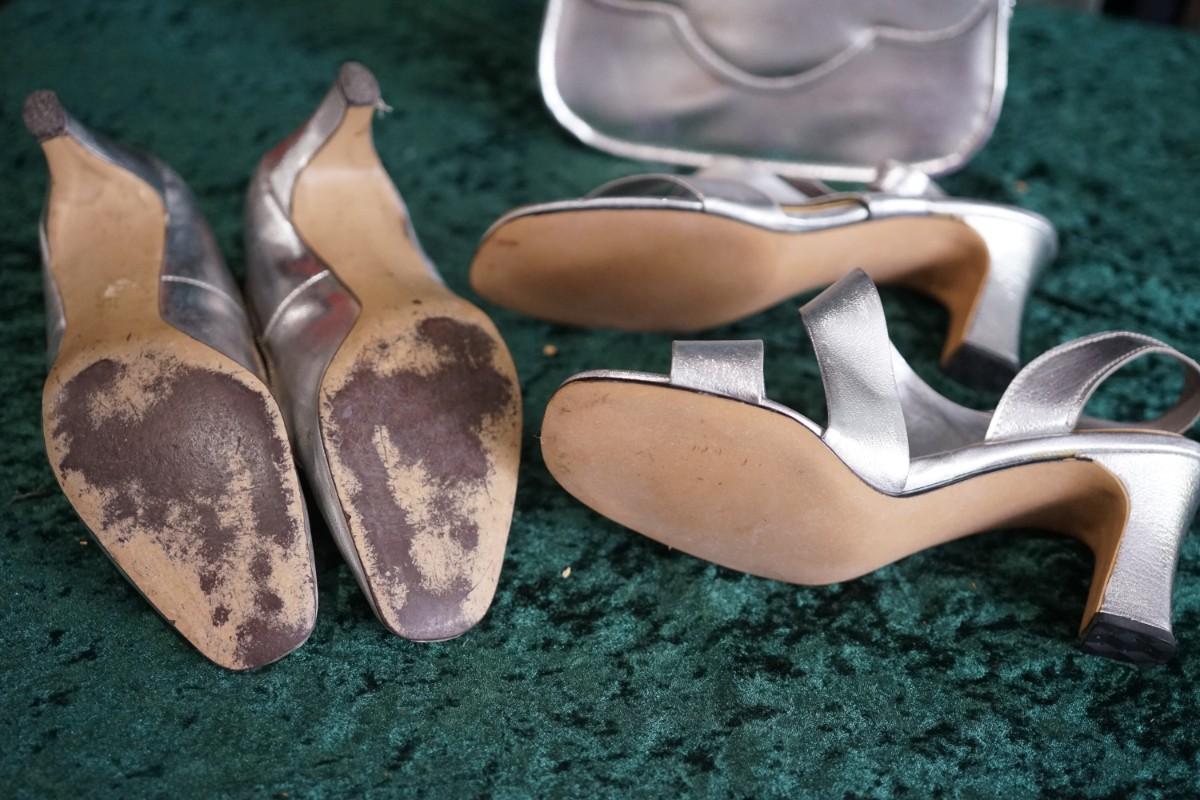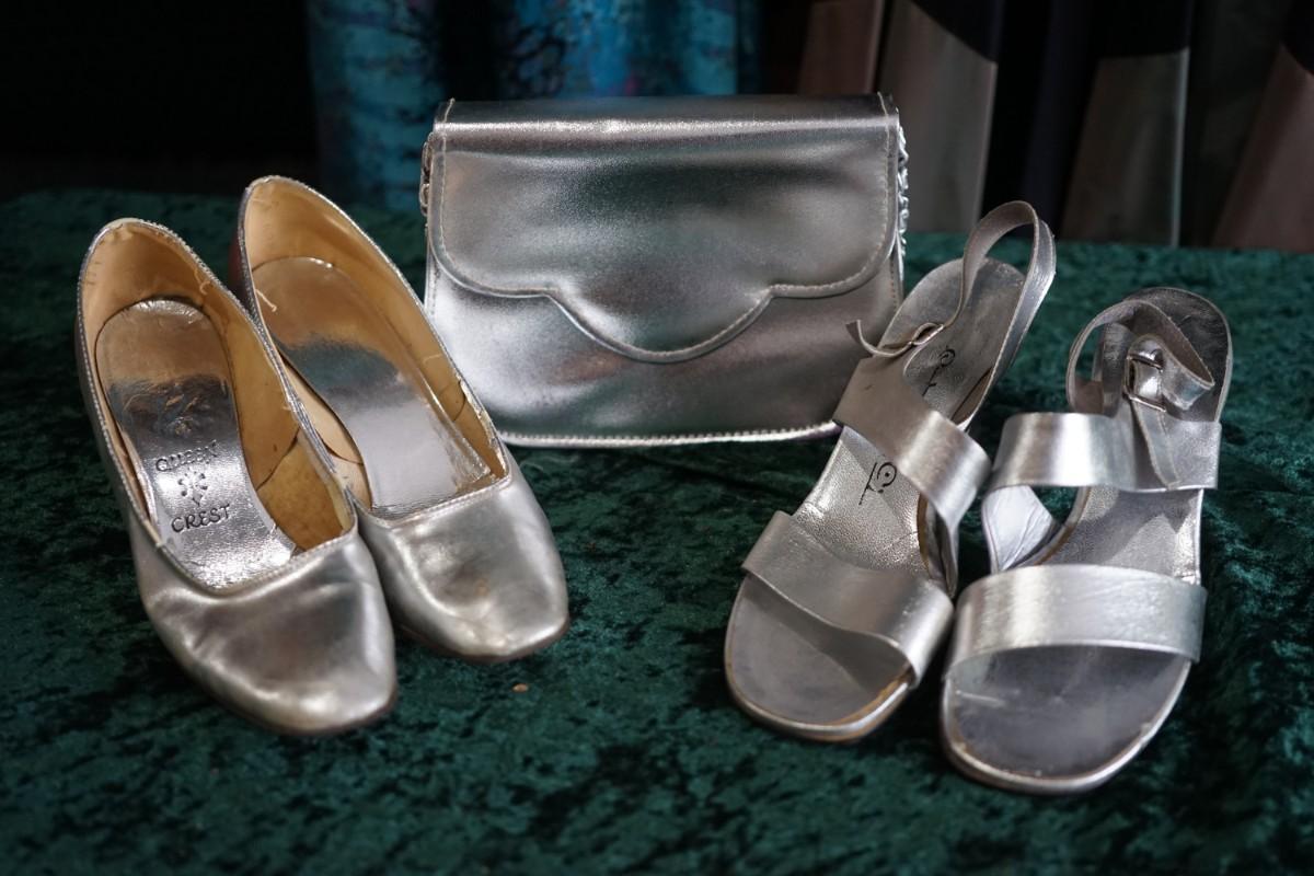 VINTAGE SILVER COLORED HANDBAG WITH CHAIN HANDLE AND TWO PAIRS OF SILVER COLORED LADIES SHOES