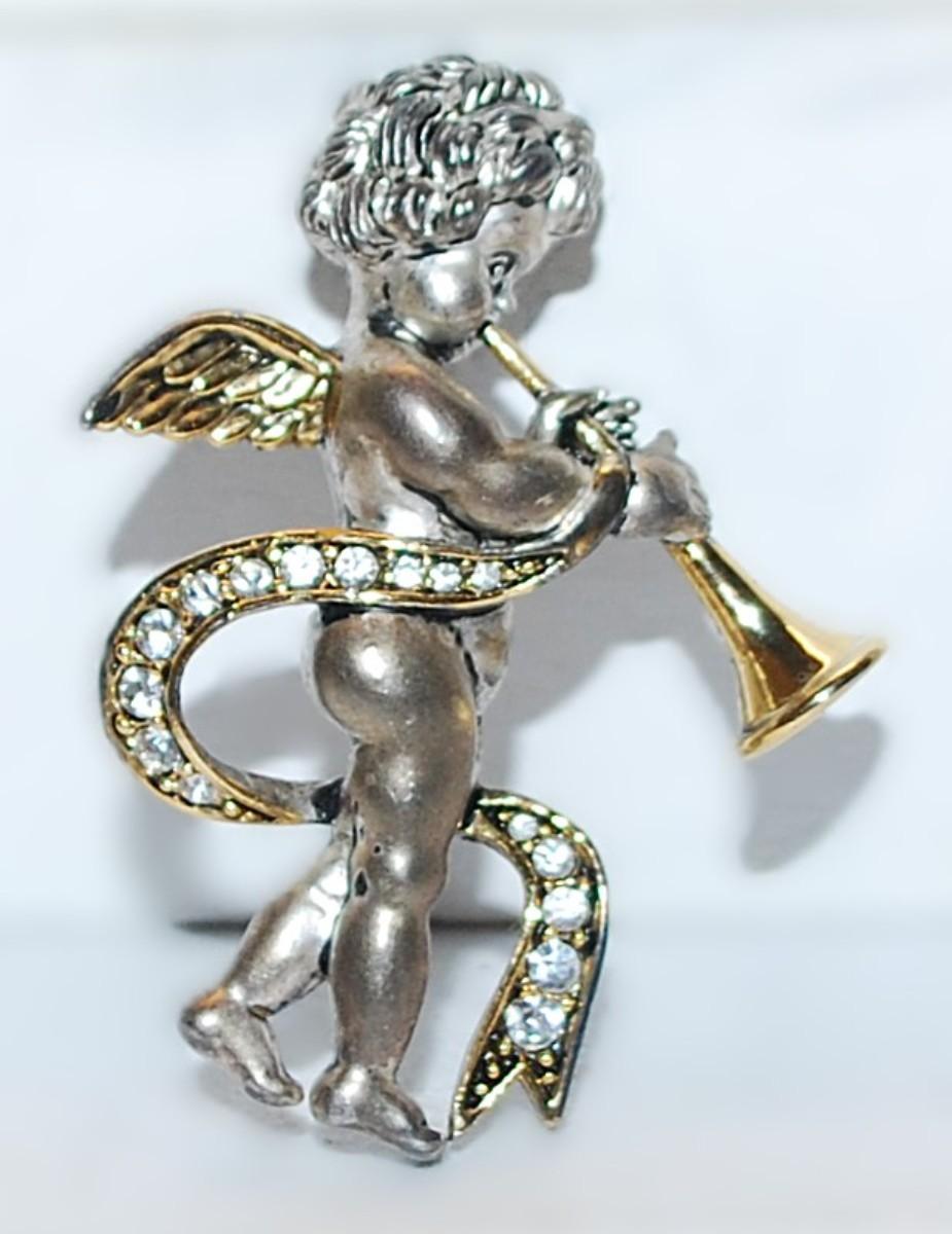 VINTAGE Silver & Gold Colored Horn-Blowing CHERUB BROOCH (2" x 1½") on a Silver Tone Setting