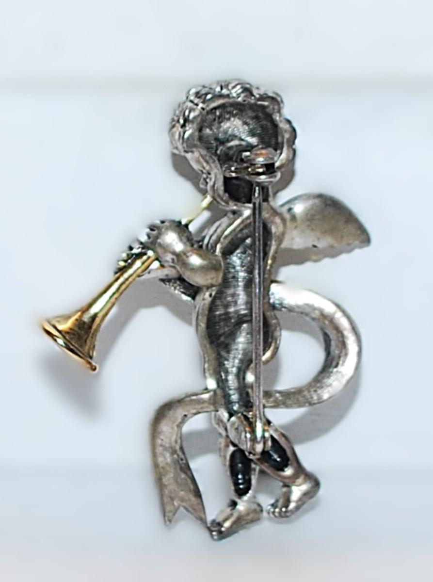 VINTAGE Silver & Gold Colored Horn-Blowing CHERUB BROOCH (2" x 1½") on a Silver Tone Setting