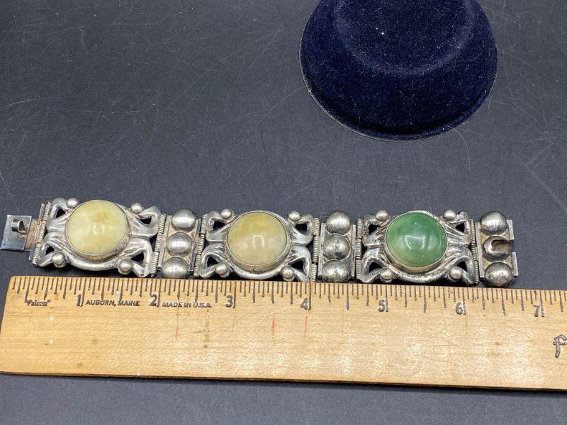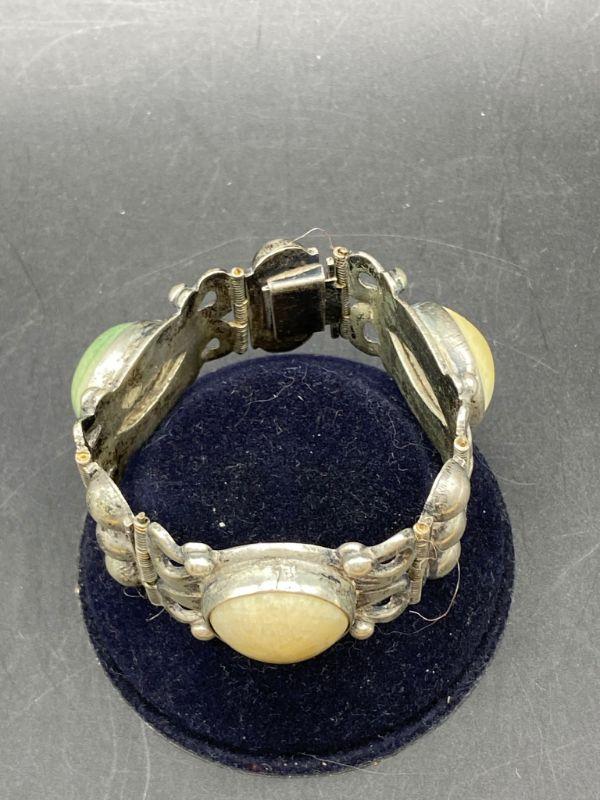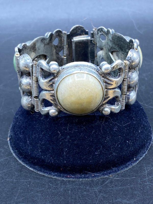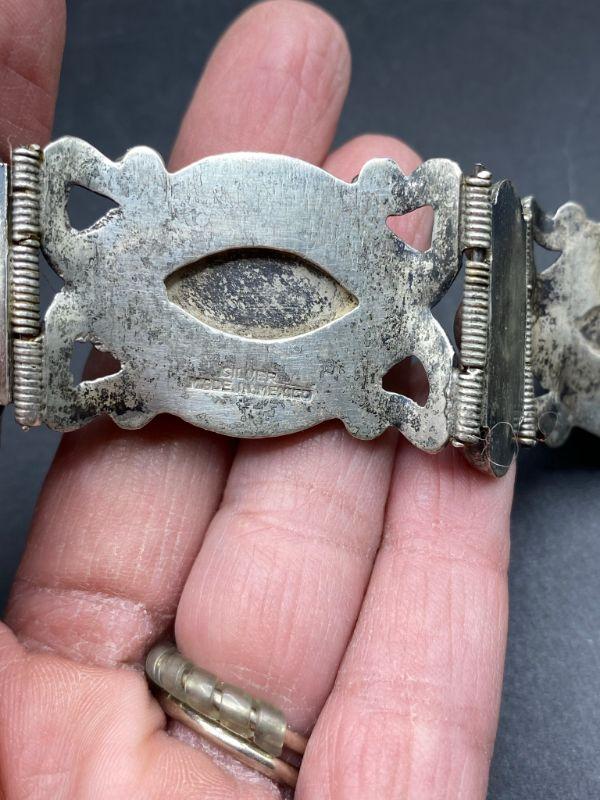 Vintage silver panel bracelet. Panels are hinged together with smaller pieces. Three large round natural stone cabochons in the center of panels, various colors. Stamped silver and Mexico on the back side. About 1" wide. Total bracelet length is about 7"