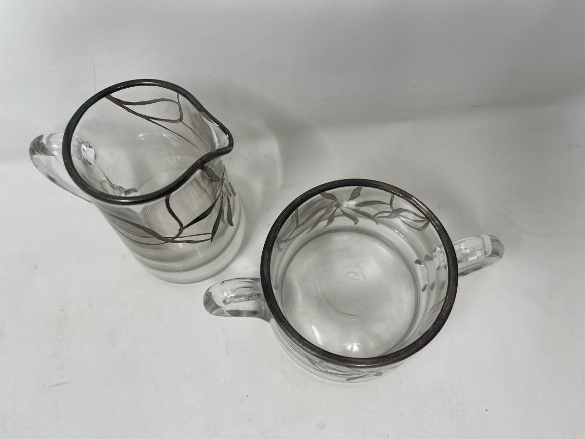 Vintage open sugar and matching creamer with silver overlay. Creamer is 4" high x 2" wide and the sugar is 3" wide x 2 1/2" high. Both show slight wear. # 495