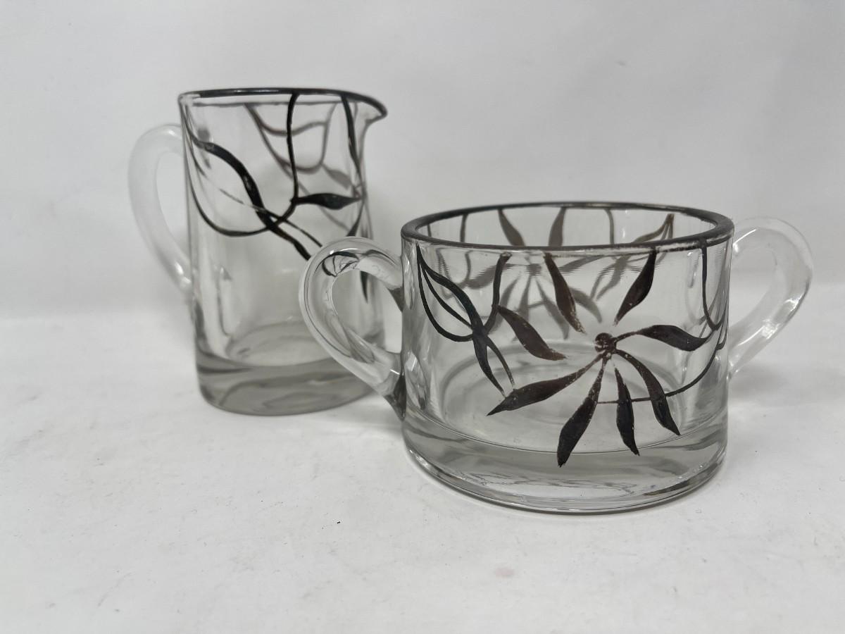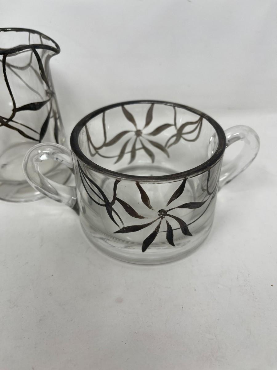 Vintage open sugar and matching creamer with silver overlay. Creamer is 4" high x 2" wide and the sugar is 3" wide x 2 1/2" high. Both show slight wear. # 495