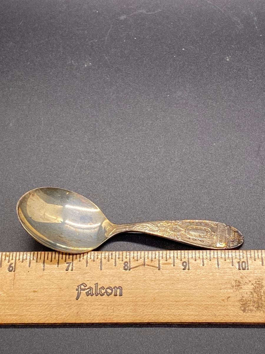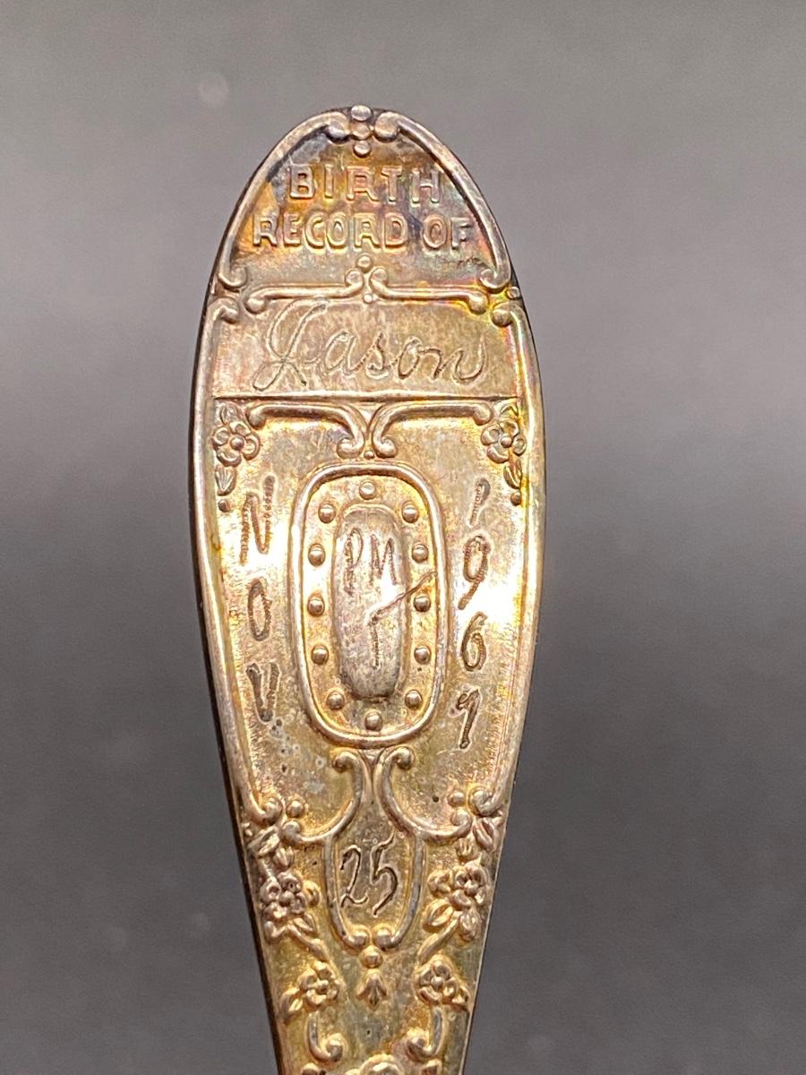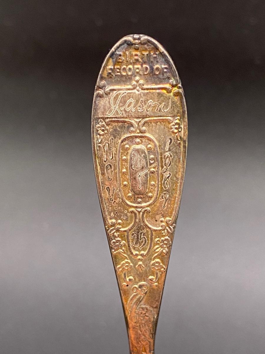 Vintage silver plate engraved baby spoon. Spoon handle is graved with name, birthdate, and birth time. About 4" size.