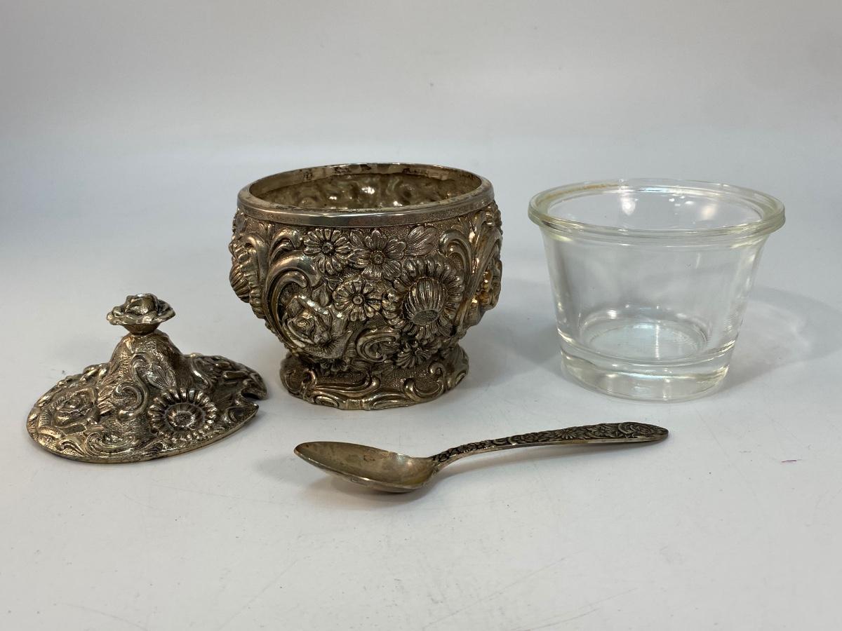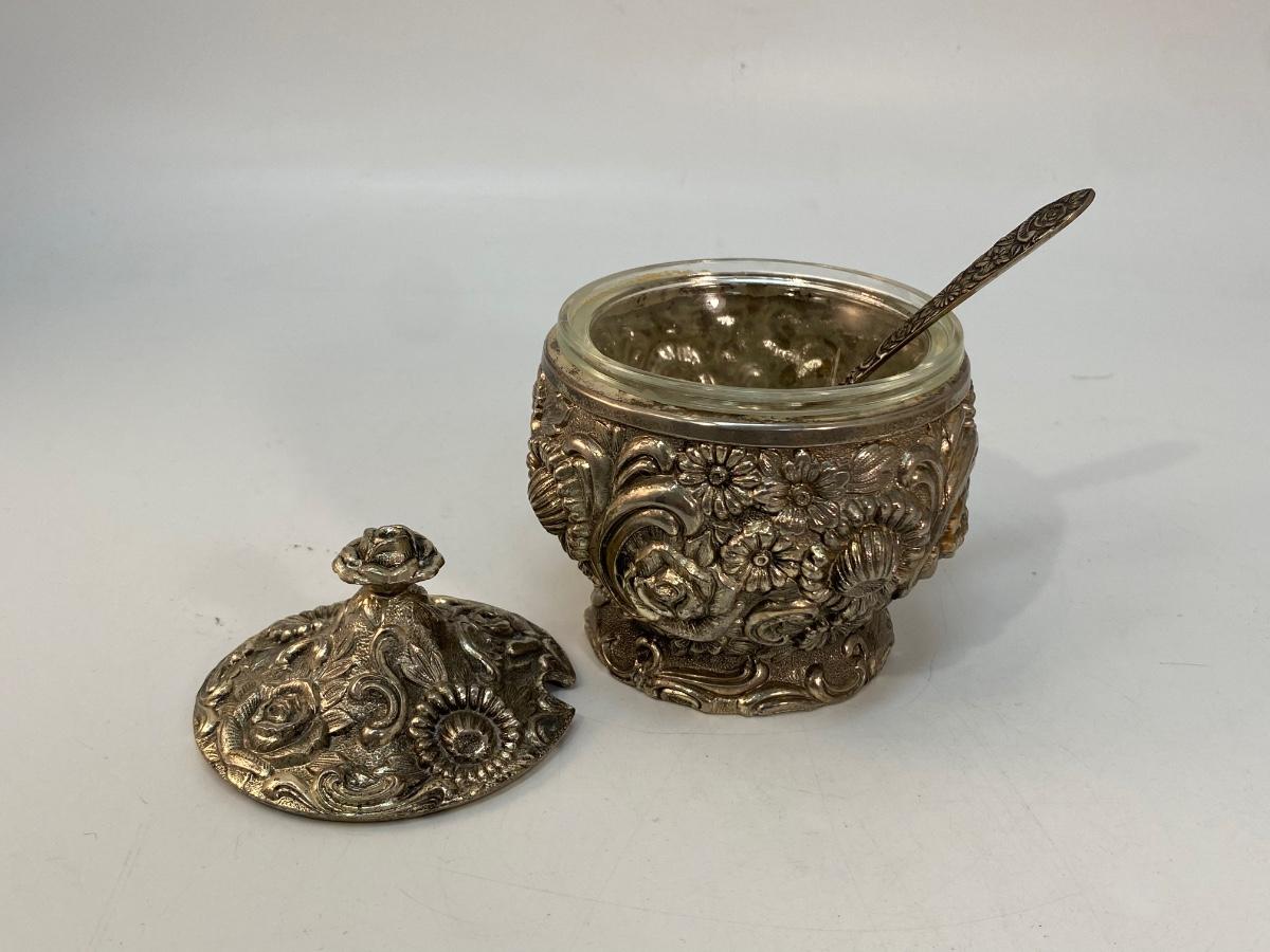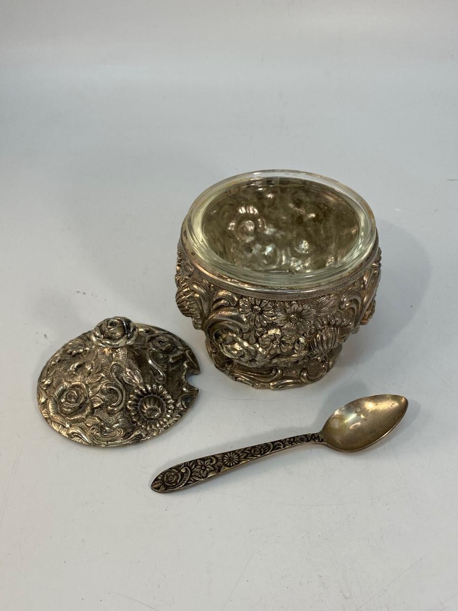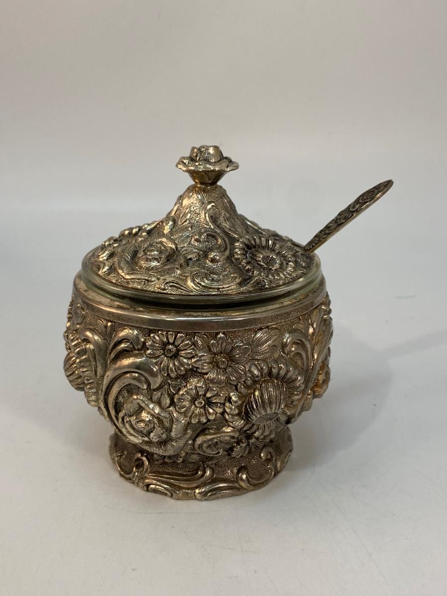 Vintage Silver Plate Floral Embossed Lidded Sugar Jam Jelly Dish w Glass Bowl & Spoon