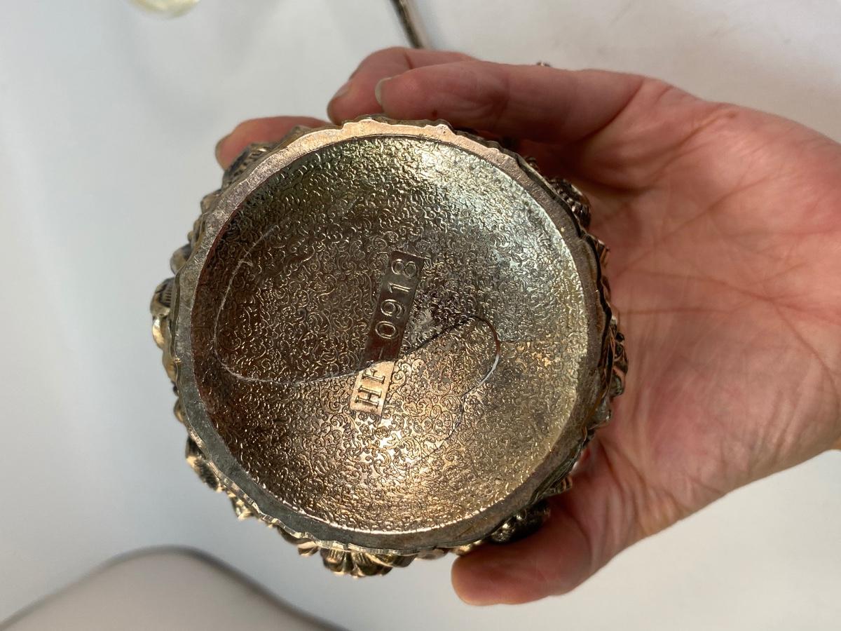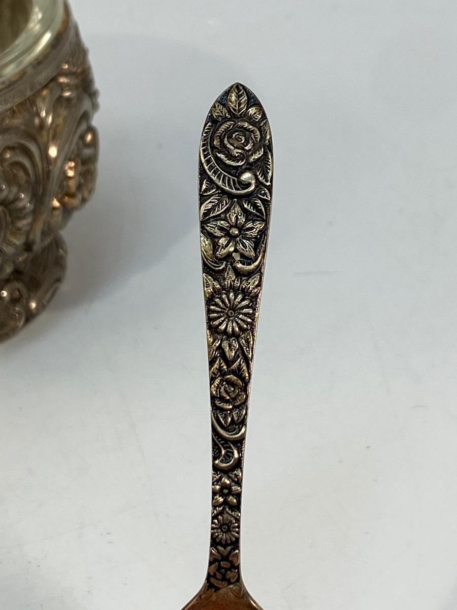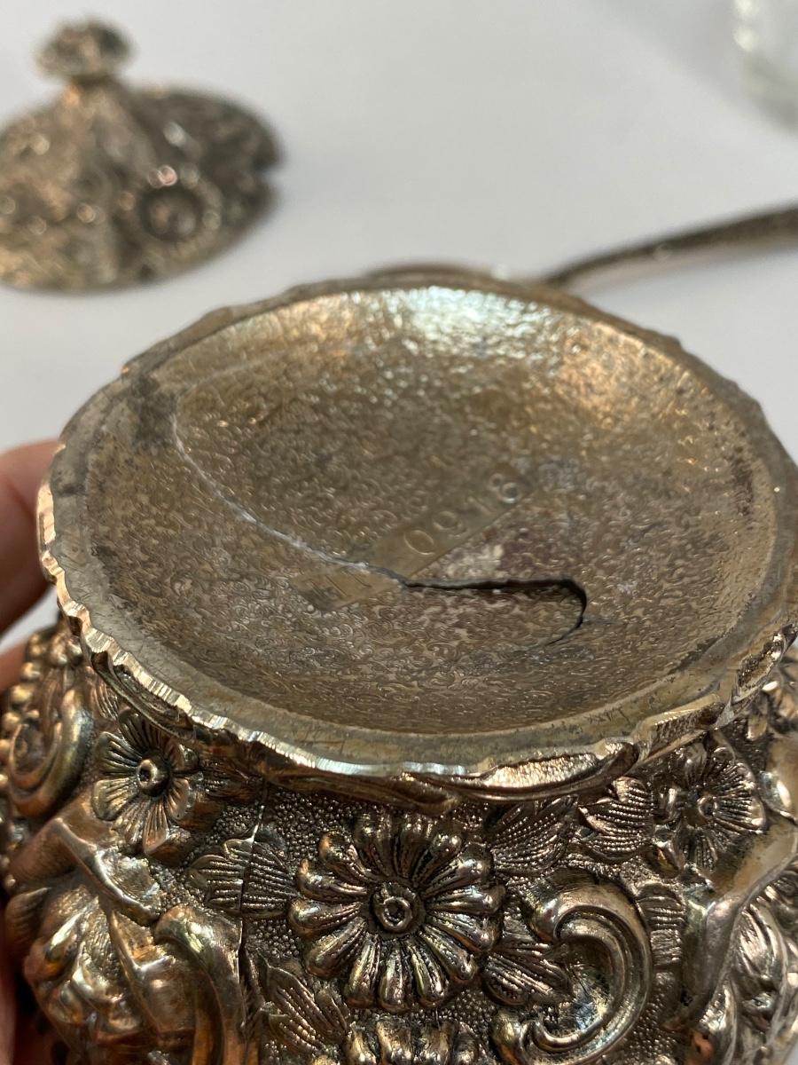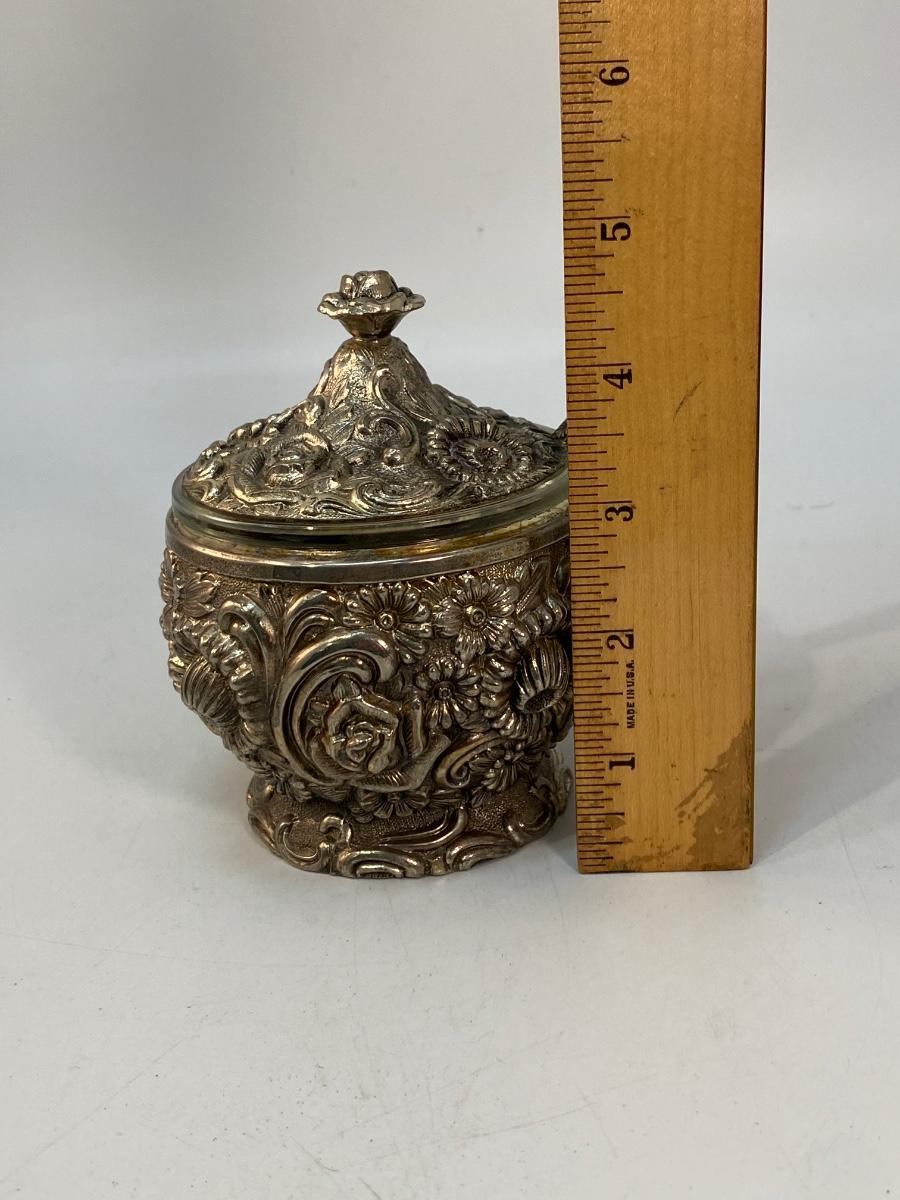 Vintage Silver Plate Floral Embossed Lidded Sugar Jam Jelly Dish w Glass Bowl & Spoon
