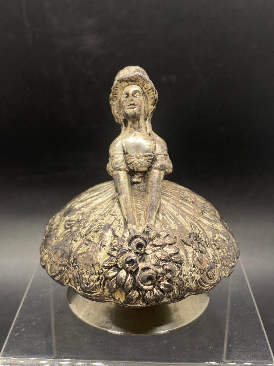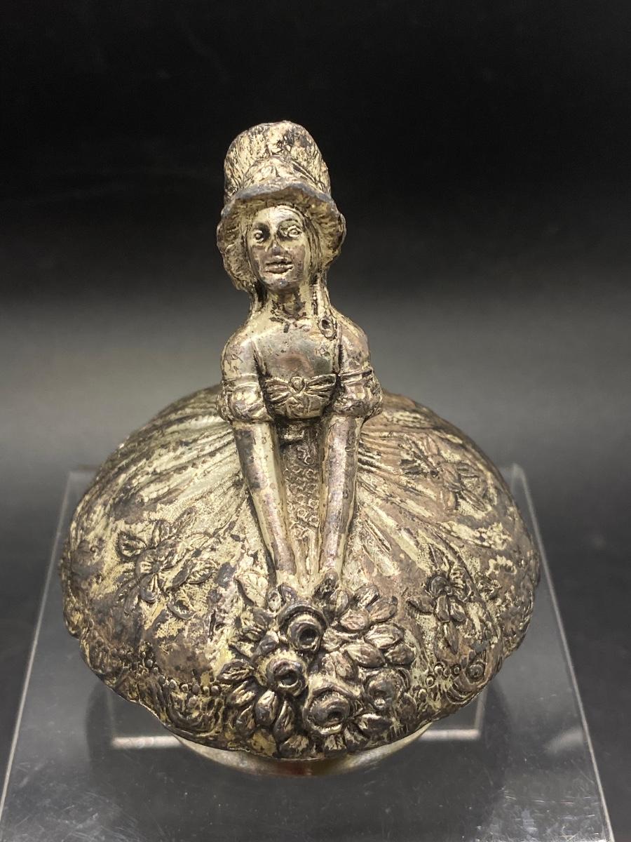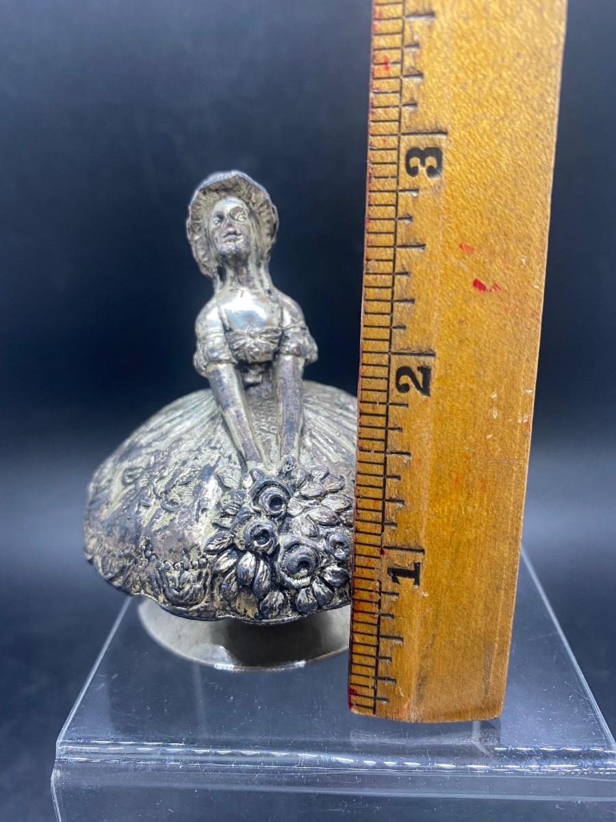 Vintage Silver Plate Metal Lady w Full Skirt and Flowers Small Bell