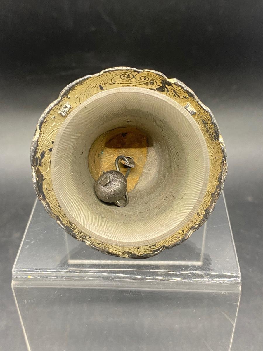 Vintage silver plate metal bell of a lady in full skirt with flowers. Has signs of age and wear. Only about 3" size.