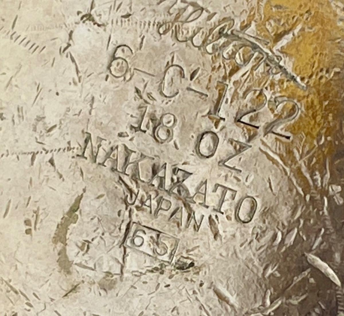 Made by NAKAZATO in Japan, 18 oz capacity, has heat blemish marks on the silver-plate due to use with hot liquids.
