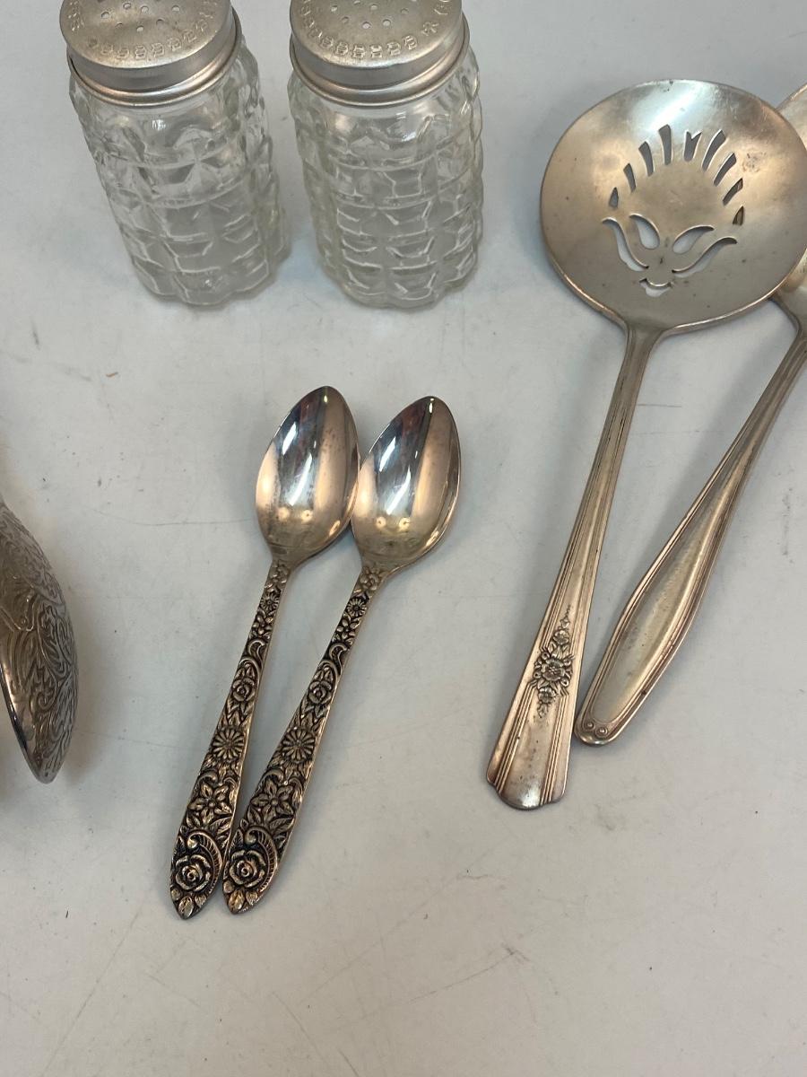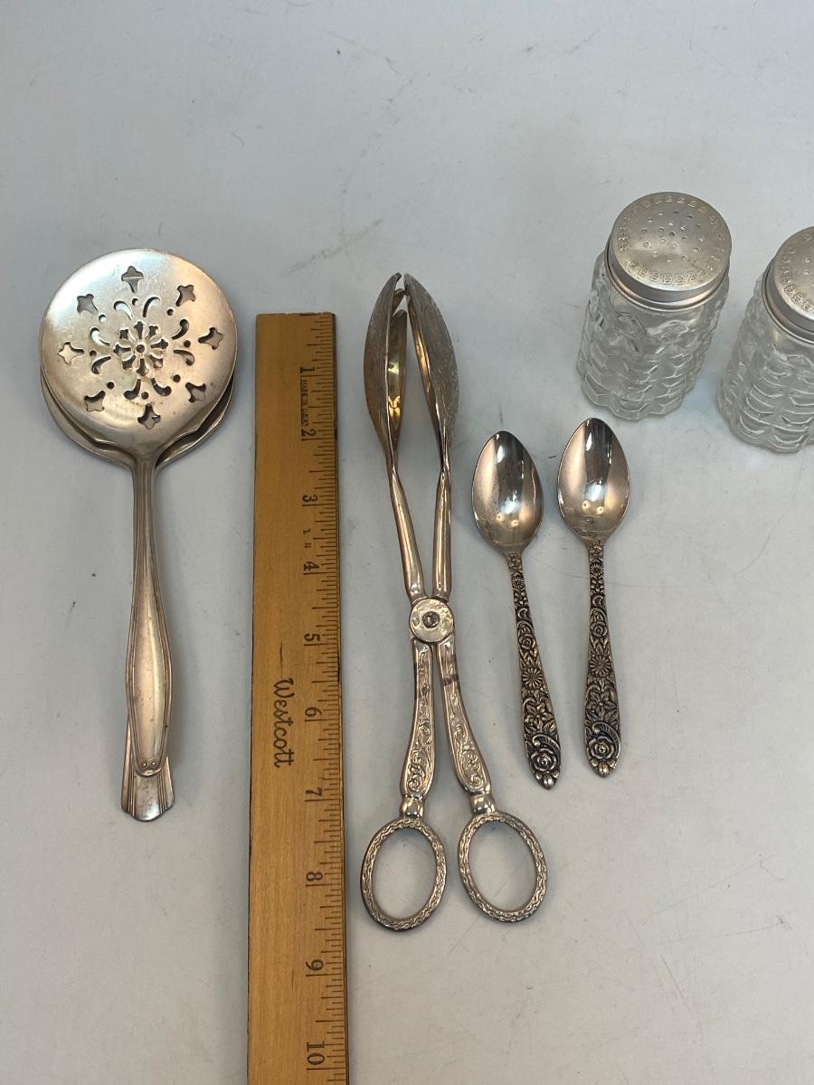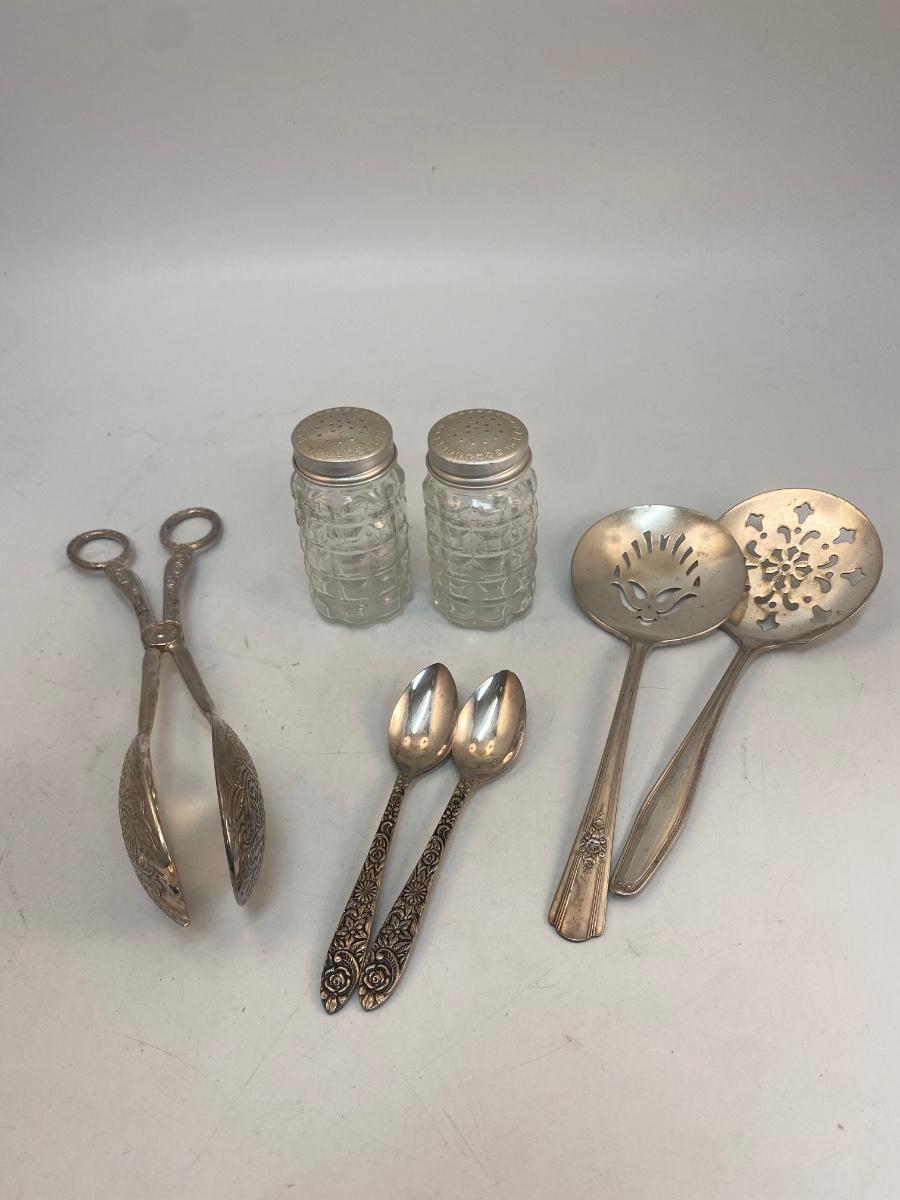 Vintage Silver Plate Serving Pieces and Shaker Set. Salad tongs, teaspoons, and slotted serving spoons in different patterns. Glass shakers with metal screw on lids. All are in good vintage condition.