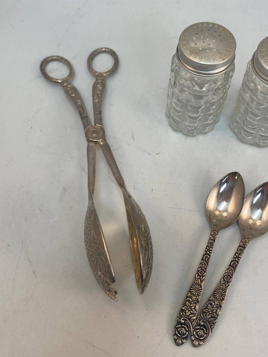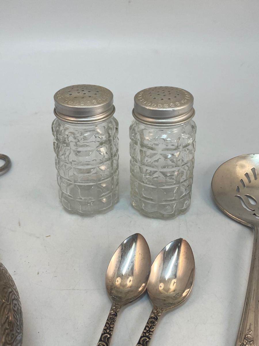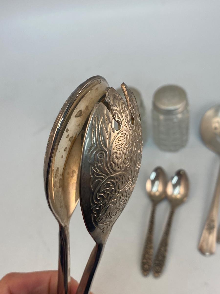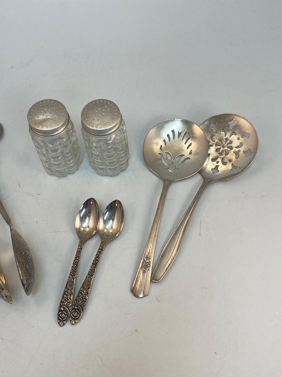 Vintage Silver Plate Serving Pieces and Shaker Set. Salad tongs, teaspoons, and slotted serving spoons in different patterns. Glass shakers with metal screw on lids. All are in good vintage condition.